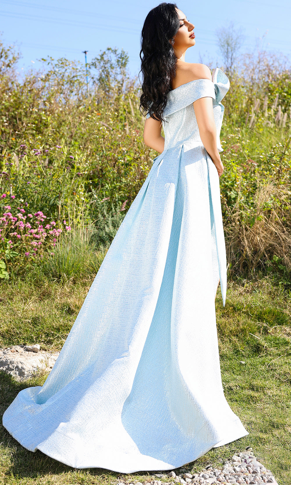 Be fabulous in the Terani Couture 252E5169 gown that captivates at first glance with its harmonious mix of texture and silhouette. The folded off shoulder neckline flatters the shoulders, while a ruffle and bow accent adds an artistic flourish. Crafted in rich metallic jacquard, the gown features dazzling beaded appliques and a pleated overskirt with cascading ruffles on the side. The wrap sheath skirt flows to the floor and opens a daring front slit, combining movement with allure. Wearing the Terani Couture 252E5169 is the perfect way to express refined taste and distinctive style. Models are wearing Powder Blue, and Rose Gold colors.