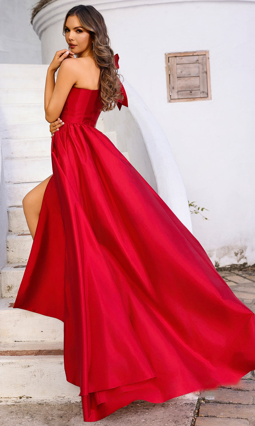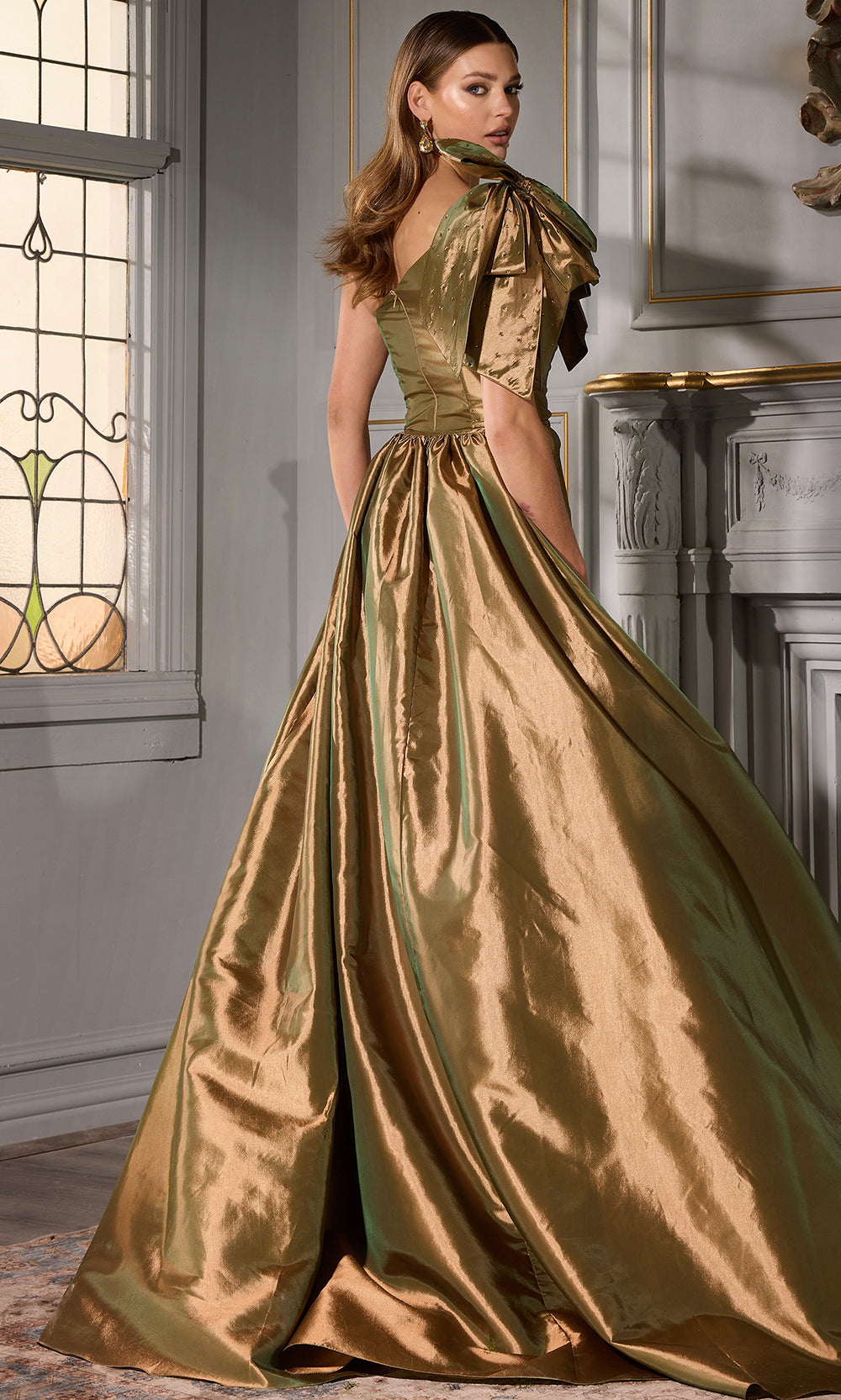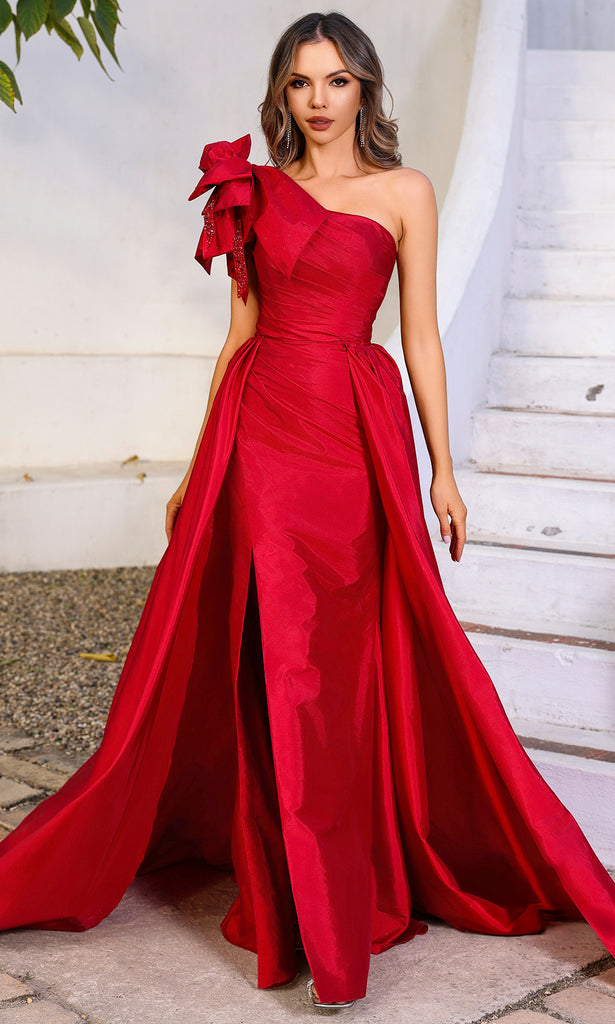 Showcasing bold femininity, the Terani Couture 252E5531 is designed to command admiration from every angle. The asymmetric neckline draws the eye with modern edge, while the oversized shoulder bow with beaded accent makes an unforgettable statement. A ruched bodice flatters the waist, and the A-line overskirt provides versatility and added drama. With a sleek column silhouette and front slit for movement, this Terani Couture 252E5531 gown delivers a perfect balance of strength, elegance, and playful glamour. Models are wearing Gold, and Red colors.