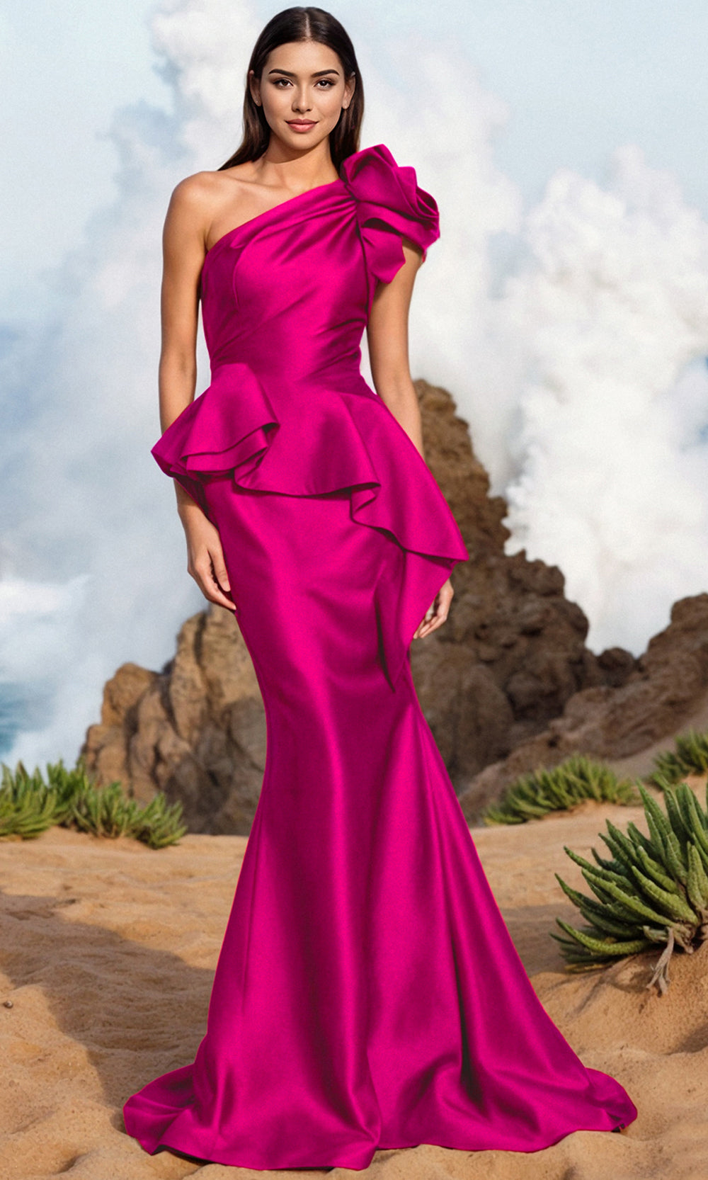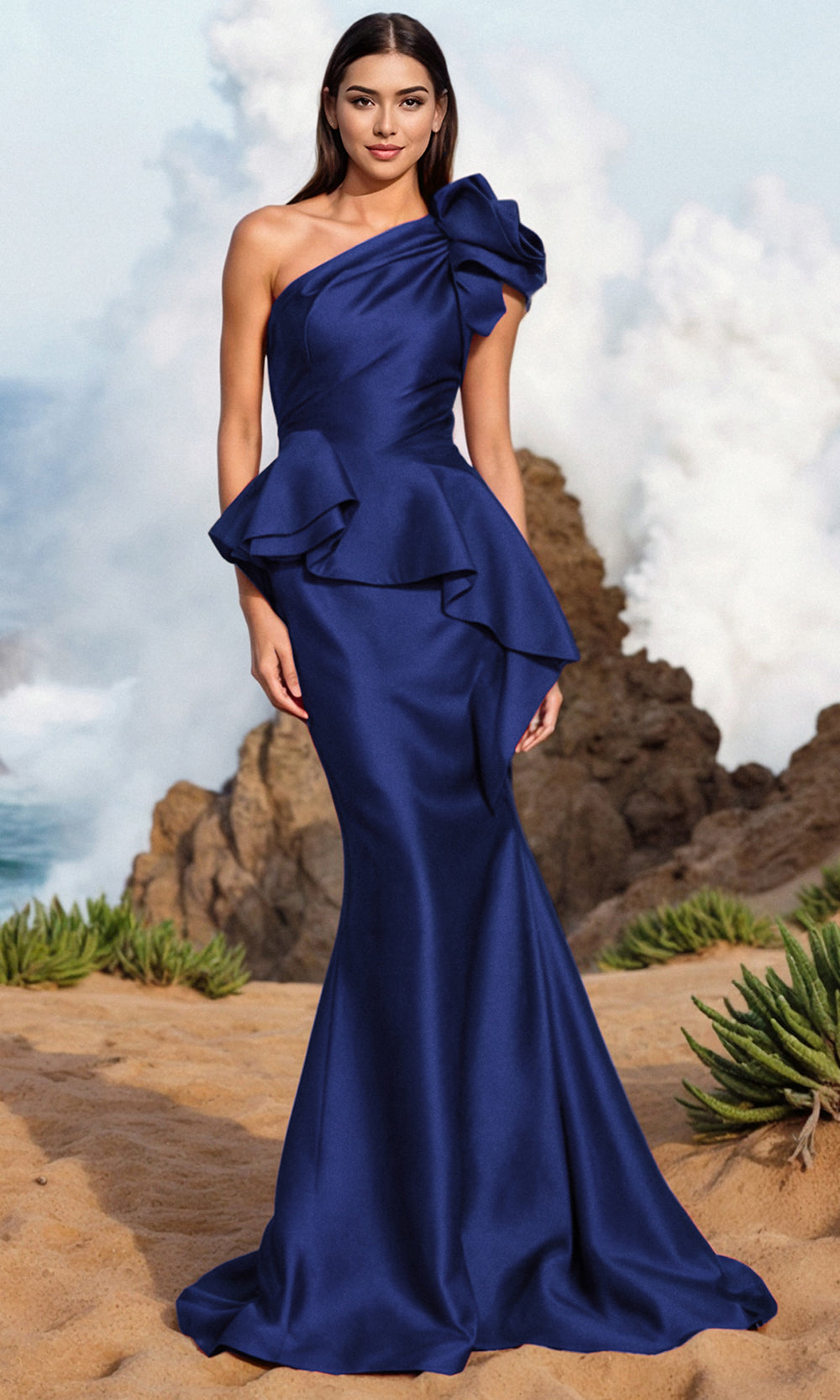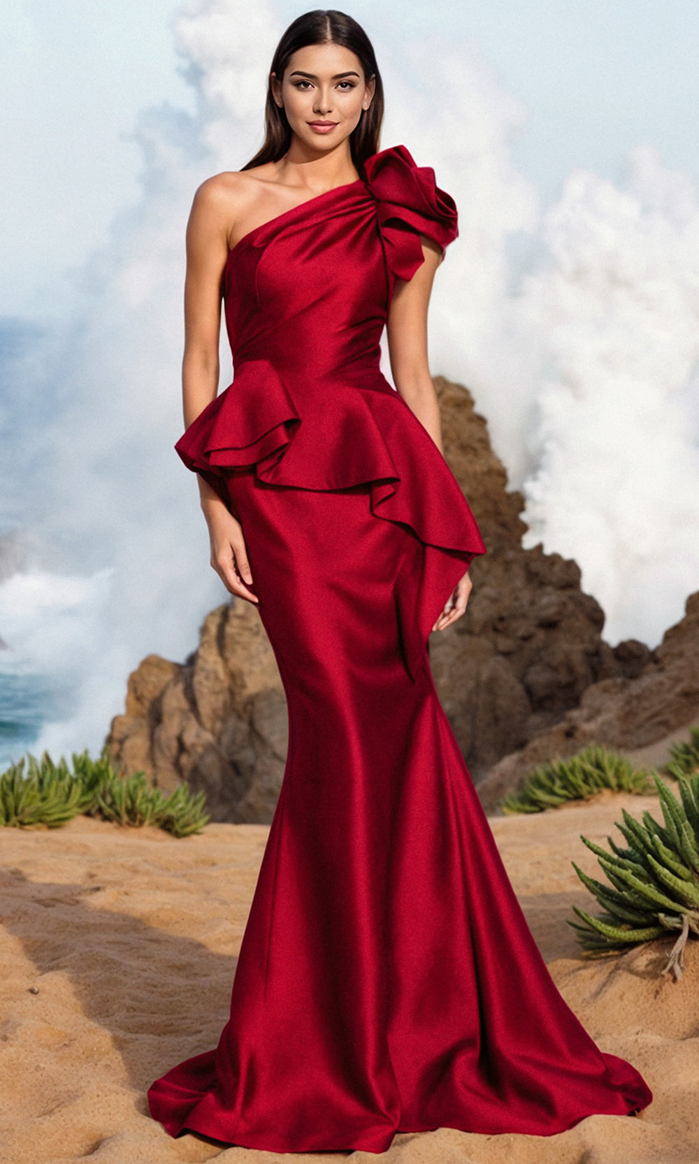 The Terani Couture 252E5546 is a striking example of contemporary glamour, perfect for fashion-forward women. This gown showcases an asymmetric neckline and one shoulder short sleeve enhanced by dramatic layered ruffles. The structured peplum detail at the waist seamlessly blends into the mermaid skirt, sculpting an hourglass shape. From weddings to evening galas, the Terani Couture 252E5546 ensures you command attention with its bold design and flawless craftsmanship, leaving an unforgettable impression. Models are wearing Black, Emerald, Fuchsia, Navy, and Red colors.