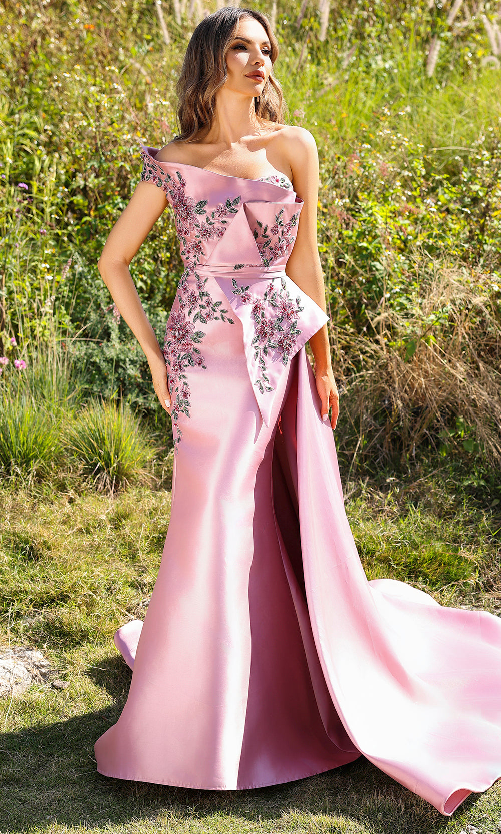 | Details: | Off Shoulder Sleeve, Floral Embroidery, Pleated Overskirt, Peplum |
