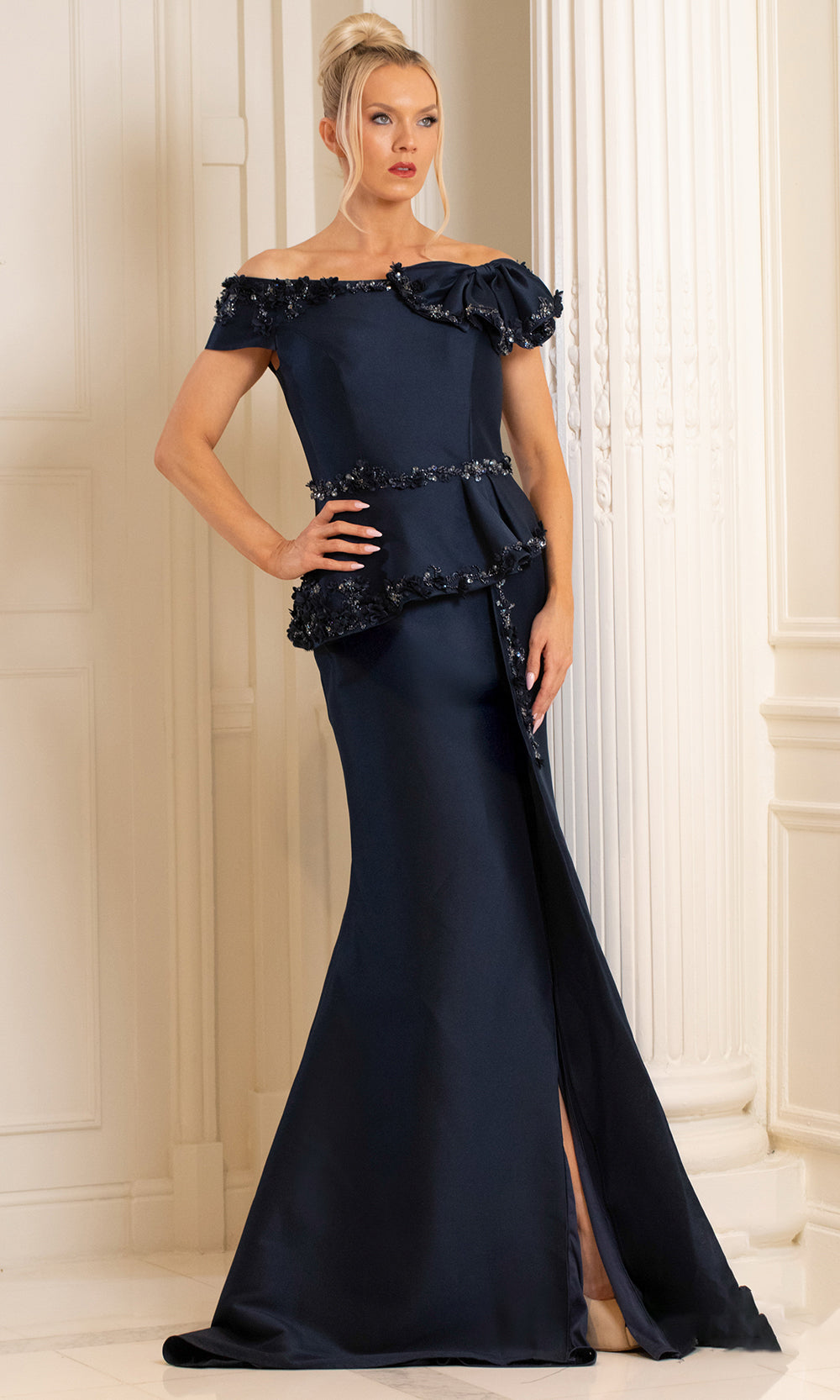 Make a bold statement with the Terani Couture 252M5328, a stunning design crafted for those who embrace drama. This off-shoulder gown is defined by a striking oversized bow accent, a figure-flattering peplum waist, and a daring high slit. The mermaid skirt glides over the hips and flares at the hem, offering a head-turning silhouette. 3D floral applique and dazzling beaded details add depth and elegance to the overall design. Perfect for black-tie affairs and formal galas, this Terani Couture 252M5328 gown promises to leave a lasting impression wherever you go. Models are wearing Champagne, and Navy colors.