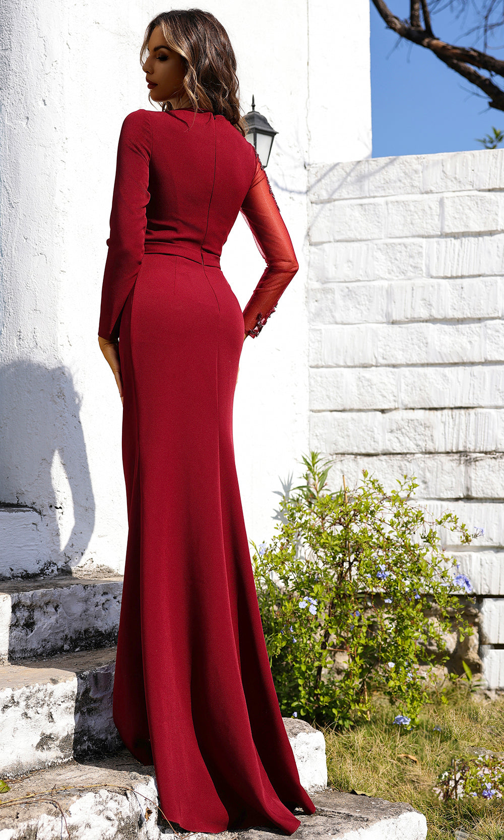 The Terani Couture 252M5341 reflects polished sophistication, designed for women who appreciate refined style. This breathtaking gown features a bateau illusion neckline that beautifully accentuates the face, while the bodice sparkles with intricate beaded detailing. The ruched waistline creates a flattering silhouette, and the long sleeves provide an added touch of class. The sheath shape effortlessly skims the figure, offering timeless charm. Wearing the Terani Couture 252M5341 guarantees you will make a graceful, lasting impression at any formal celebration or black-tie affair. Models are wearing Navy, and Wine colors.