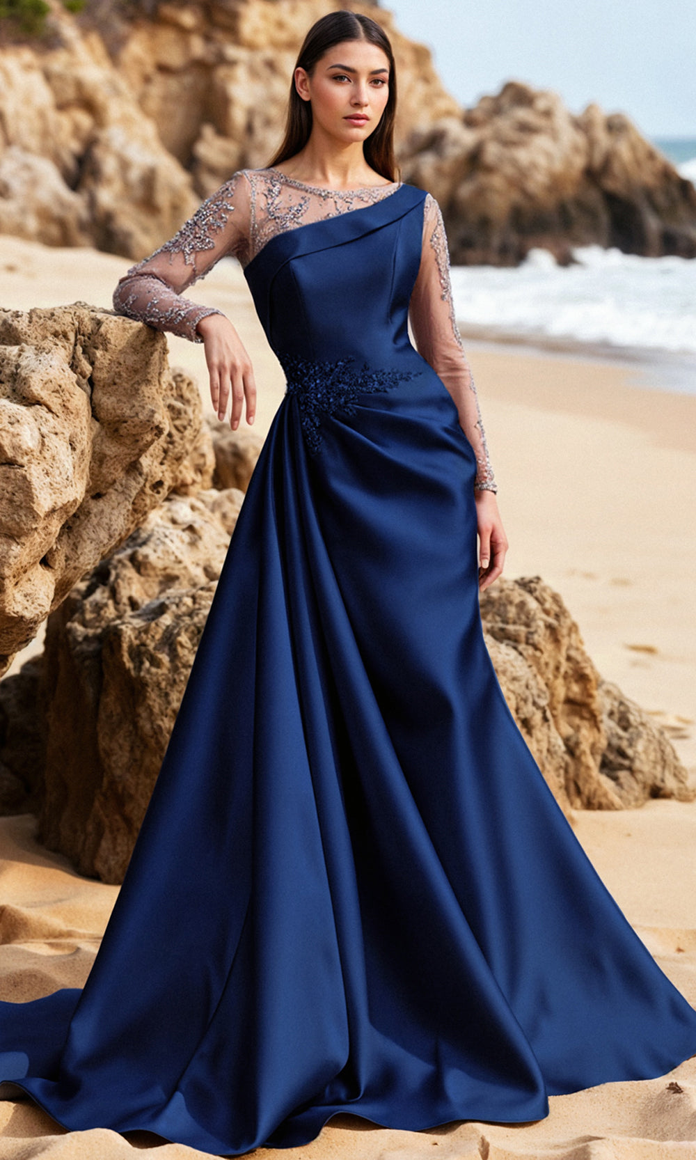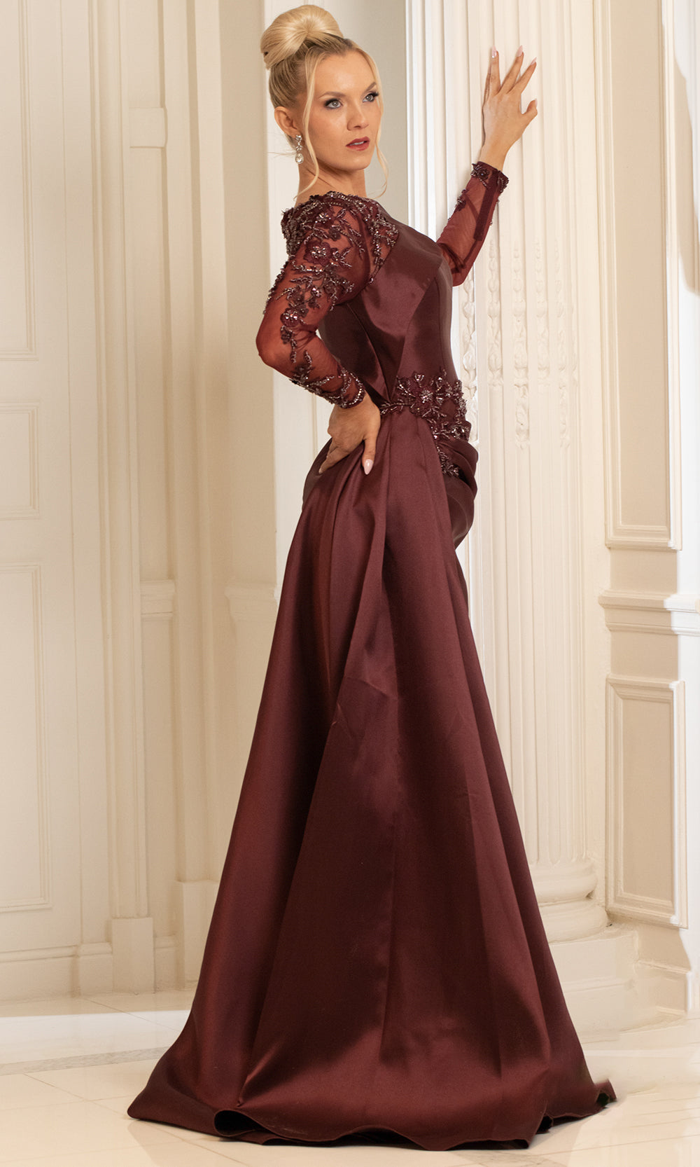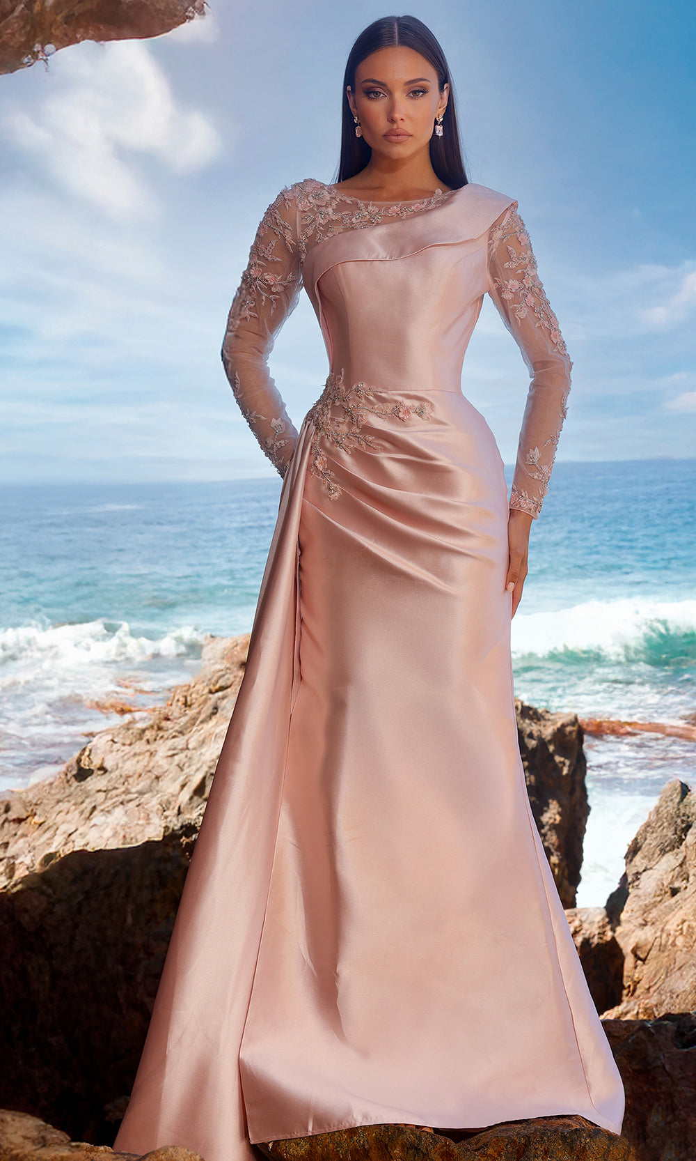 Celebrate refined beauty in the Terani Couture 252M5344, a masterpiece that radiates sophistication. The illusion bateau neckline is adorned with intricate beaded and floral embroidery, adding subtle sparkle. Long sheer sleeves bring elegant coverage, while the soft side drape enhances the sleek sheath silhouette. Ideal for black-tie events and formal weddings, this Terani Couture 252M5344 long gown guarantees you will captivate the room with your polished presence. Models are wearing Blush, Mink, Navy, and Wine colors.
