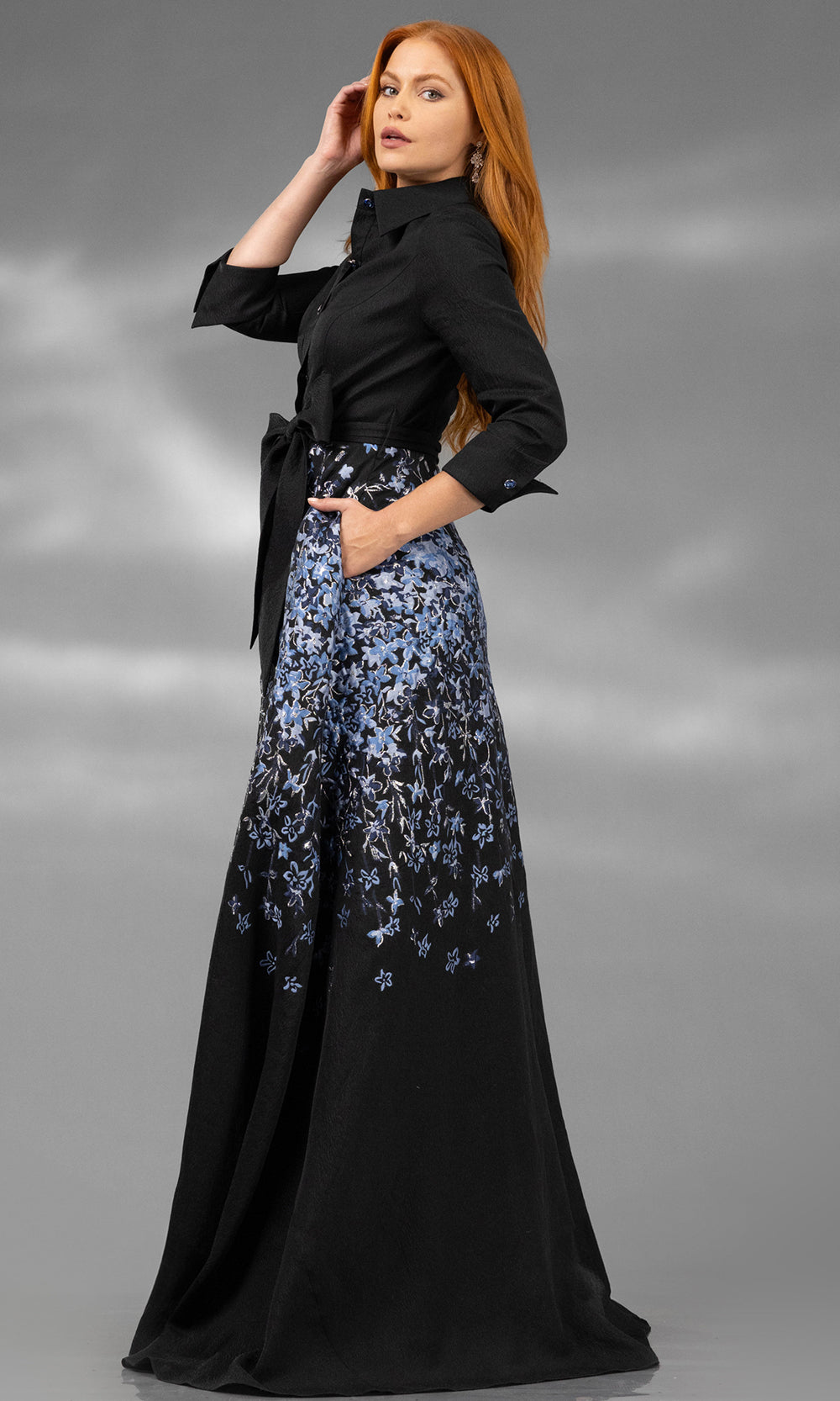 Celebrate effortless sophistication with the Terani Couture 252M5503 design . This jacquard gown features a floral embroidery adornment flowing into an A-line skirt, offering graceful movement. Designed with a collared v-neckline, front buttons, and a waist-defining bow, it perfectly balances classic charm with contemporary detail. Side pockets provide a touch of modern practicality, while the quarter-length sleeves complete the polished silhouette. The Terani Couture 252M5503 masterpiece brings a refined touch to any formal wardrobe. Model is wearing Black Blue color.