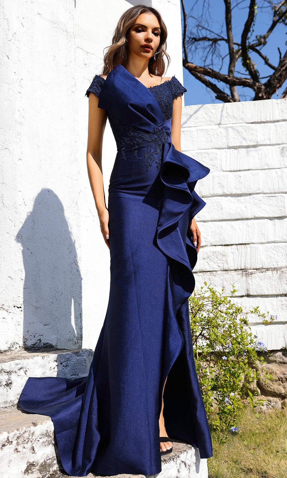 Bold design meets timeless allure in Terani Couture 252M5521 masterpiece. This captivating satin gown features an off-shoulder neckline with cap sleeves that elegantly frame the shoulders. The fitted bodice hugs the figure, while a dramatic asymmetrical ruffle and high slit add unforgettable flair. The sheath skirt with a sweeping train enhances the gown graceful movement. The floral embroidery add a touch of romantic charm. With its combination of bold details and sleek silhouette, the Terani Couture 252M5521 leaves a lasting impression. Model is wearing Navy color.
