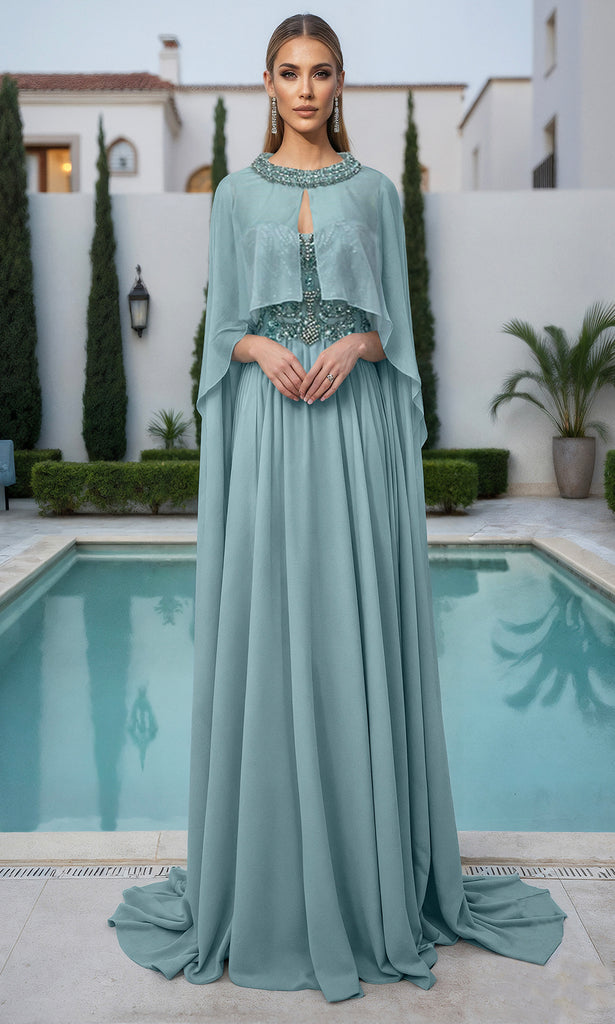 A masterpiece in refined design, the Terani Couture 261M6402 gown exudes effortless sophistication. Its chiffon fabric delivers fluid movement, complemented by an embellished bodice and sweetheart neckline. The sheer cape overlay introduces a soft, graceful dynamic, offering coverage without compromising allure. A natural waistline defines the figure, while the A-line skirt completes the gown with polished simplicity. Ideal for gala events or formal receptions, the Terani Couture 261M6402 balances classic charm with modern refinement. Model is wearing Sea Mist color.