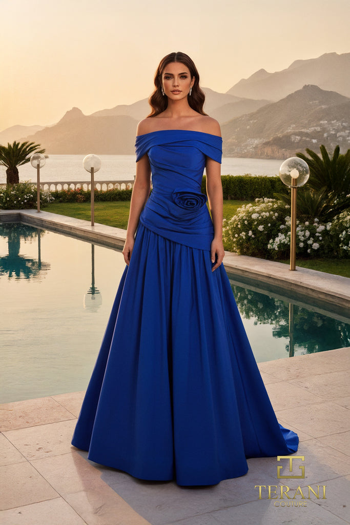 Every detail of this Terani Couture 261M6419 style captures a sense of refined elegance and timeless appeal. Tailored from luminous matte tafetta, the off shoulder neckline enhances the collarbone while gentle draping sculpts a graceful silhouette. A beautifully structured rosette adorns the waist, adding texture and dimension to the classic form. The gathered ballgown skirt create movement that feels both bold and sophisticated. Ideal for formal occasions or grand evenings, the Terani Couture 261M6419 radiates beauty in its purest form. Model is wearing Royal color.