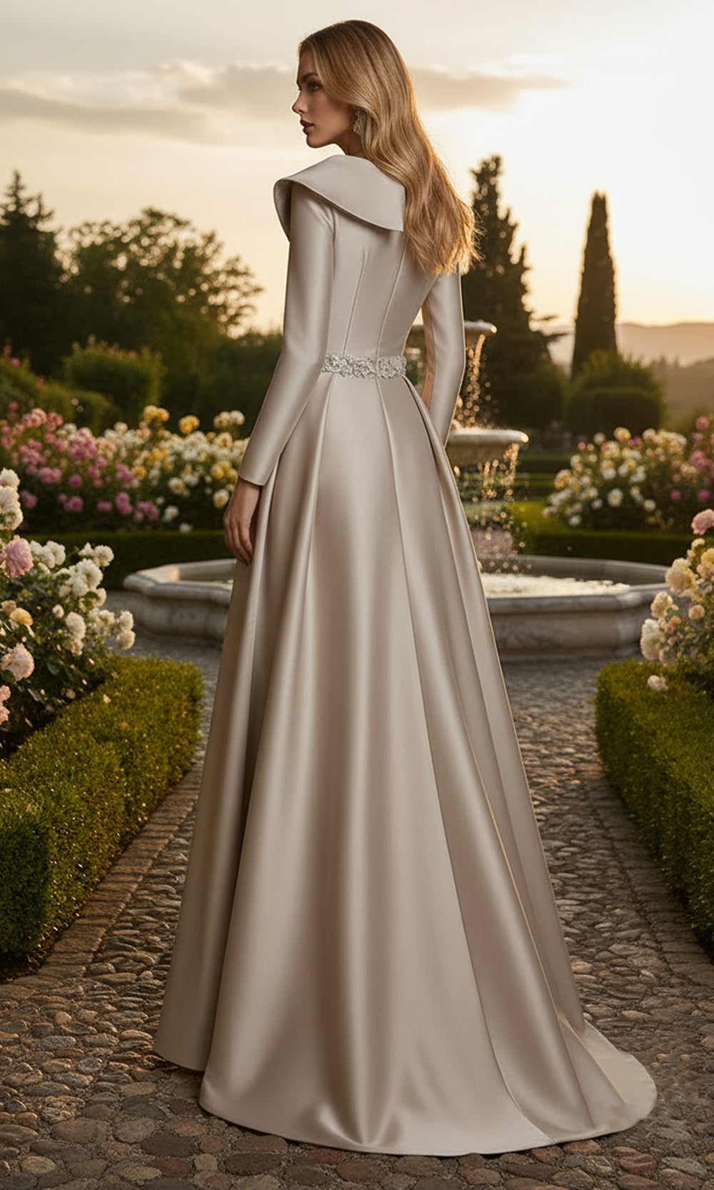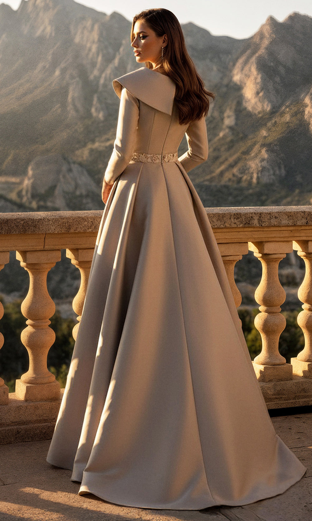 | Details: | Folded Collar, Long Sleeves, Embroidery, Pleated Overskirt, Floor Length, Belted Waist |