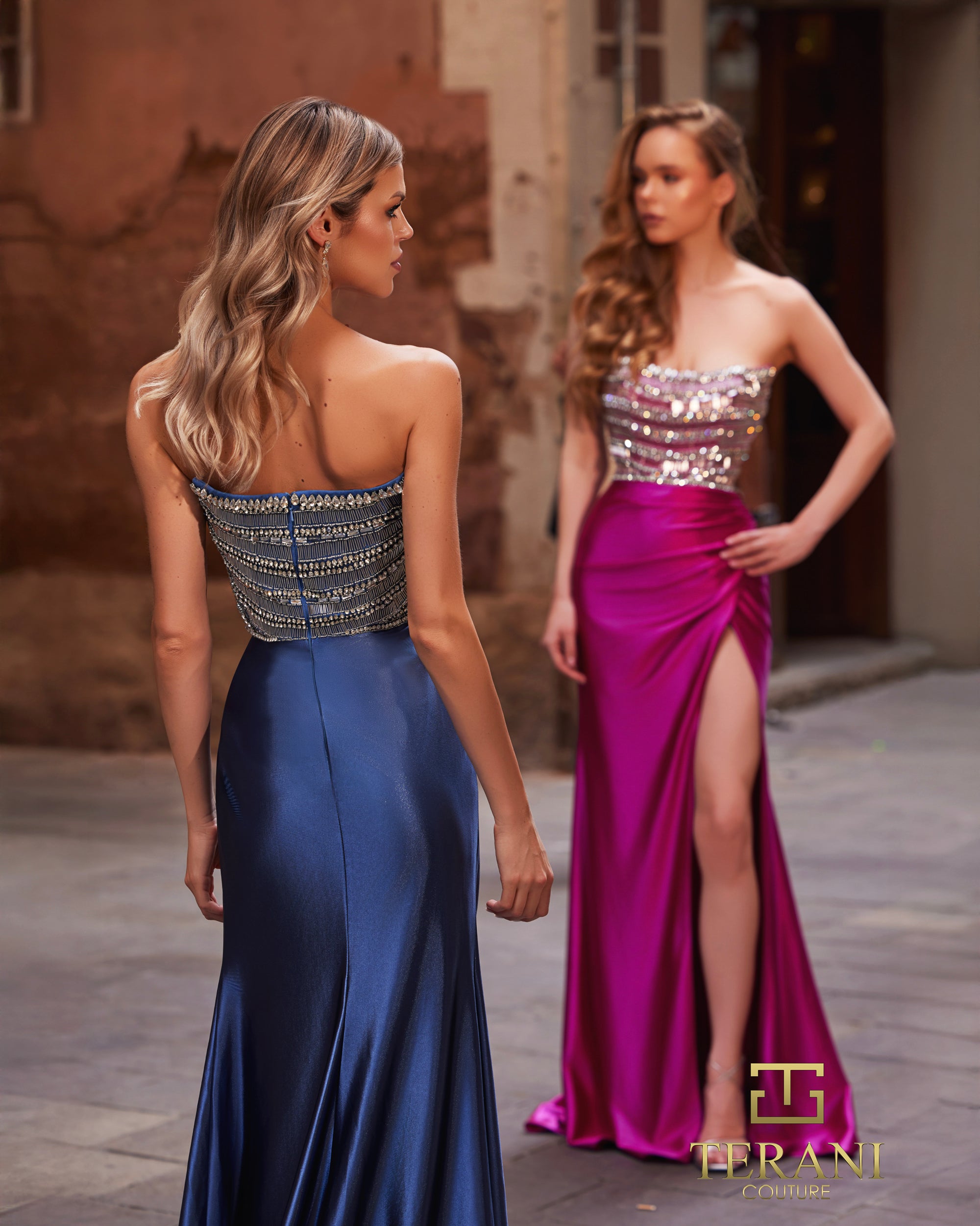 Radiant and alluring, the Terani Couture 261P6014 strapless dress redefines contemporary evening glamour. Its structured beaded bodice evokes luxury with intricate detail, offering a flattering contrast to the smooth satin sheath skirt. The ruched waistline contours the body gracefully, while the thigh-high slit adds a confident, fashion-forward edge. Perfect for special occasions where poise and sparkle are essential, this Terani Couture 261P6014 design captures the artistry and sophistication. Models are wearing Denim, and Fuchsia colors.