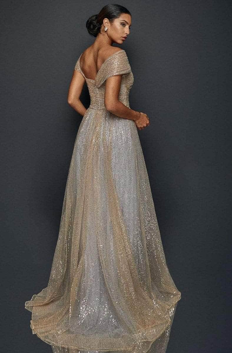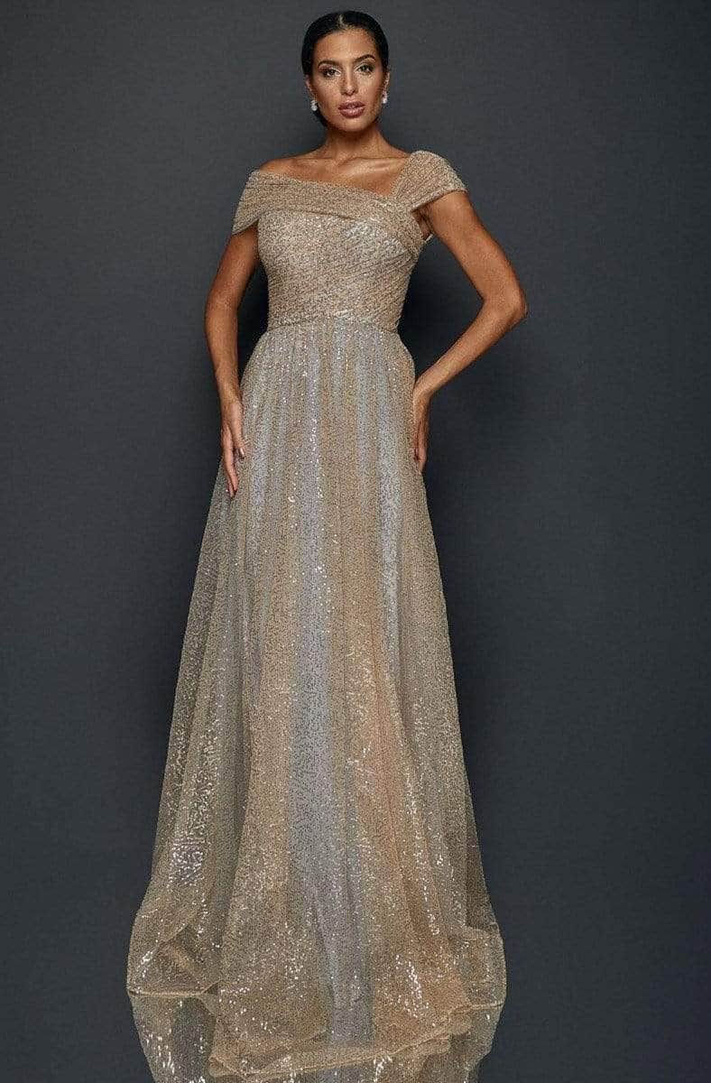 Splendidly crafted in sequin ornate mesh fabric, this striking piece brandishes in an asymmetric neckline paired with one-shoulder cap sleeves and an off-shoulder style on the other side. The perfectly fitted bodice is textured in with fine gathers bordered with a cinched waist. The dress finishes with a full A-line skirt with tonal underlayer. Model is wearing the Gold/Silver color.
