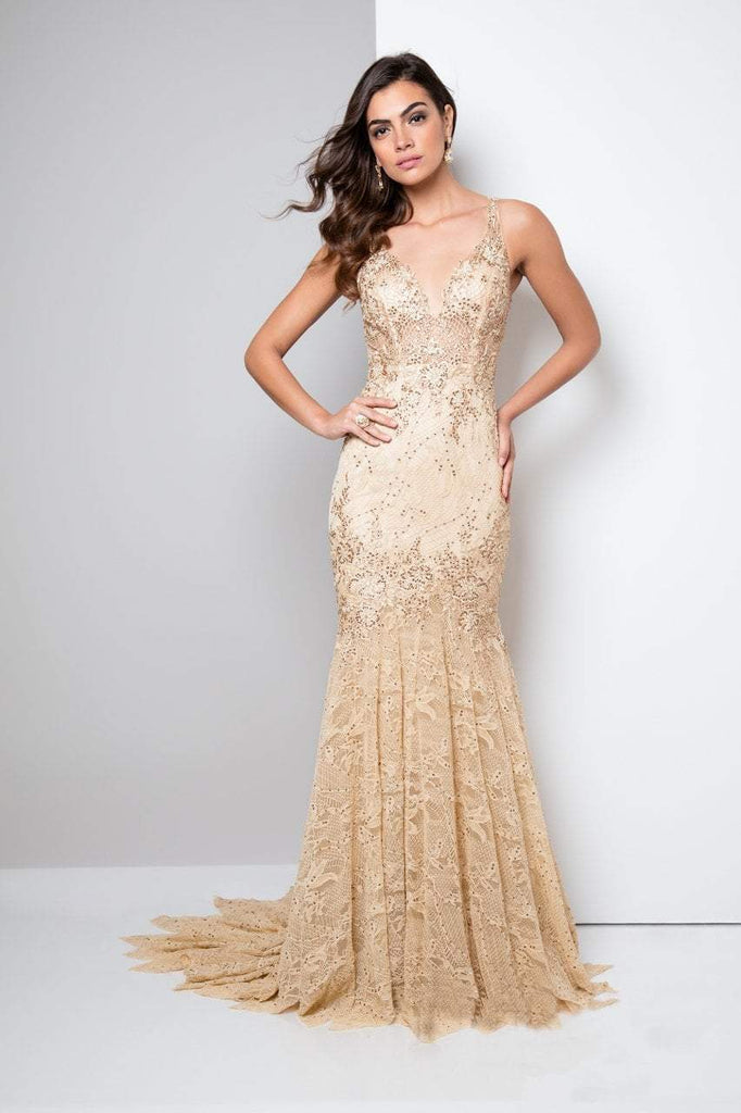 Enter the hall with grace and beauty in Terani 1711GL3526 evening dress. Champagne nude pageant wear dress with an incredible pointed hem that surrounds the lace embellished gown, featuring a sheer back detail. This is the flawless dress for your pageant competition or red carpet event. This Terani gown is perfect on your next formal event!