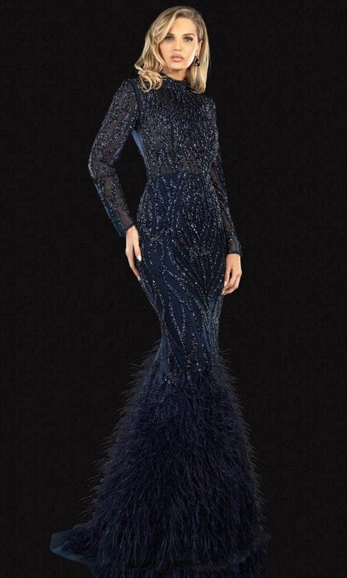 This fitted gown is gorgeously embellished with beadwork, showcasing long sleeves and a high neckline. The full back is enclosed with a back zipper while the skirt highlights a mermaid silhouette with feathers accent around the bottom and finished off with a sweep train. Model is wearing the Navy color.