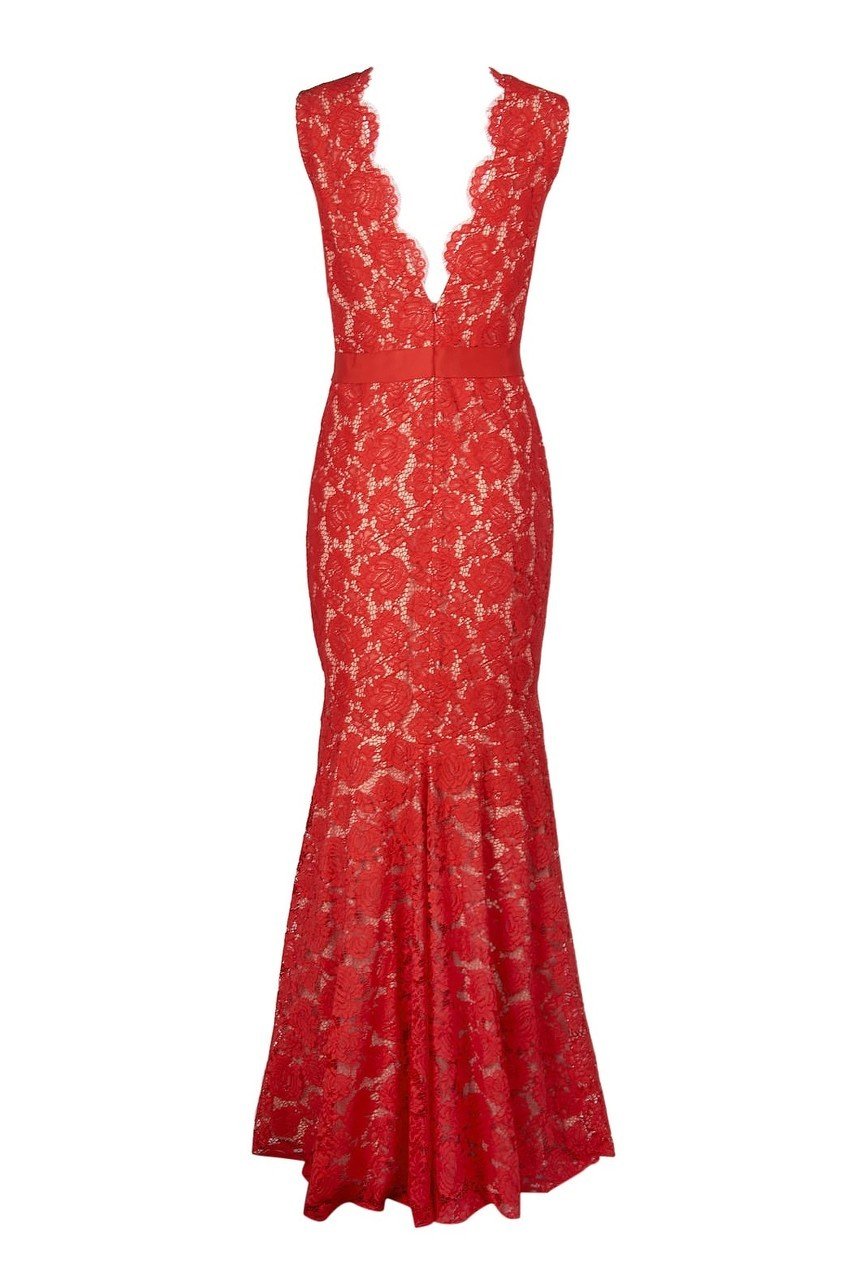 | Details: | Sheer fabric, Sleeveless, Scalloped neckline, Floral lace appliques, Thin waistband, Fitted bodice, Trumpet skirt, V-back, Back zipper |