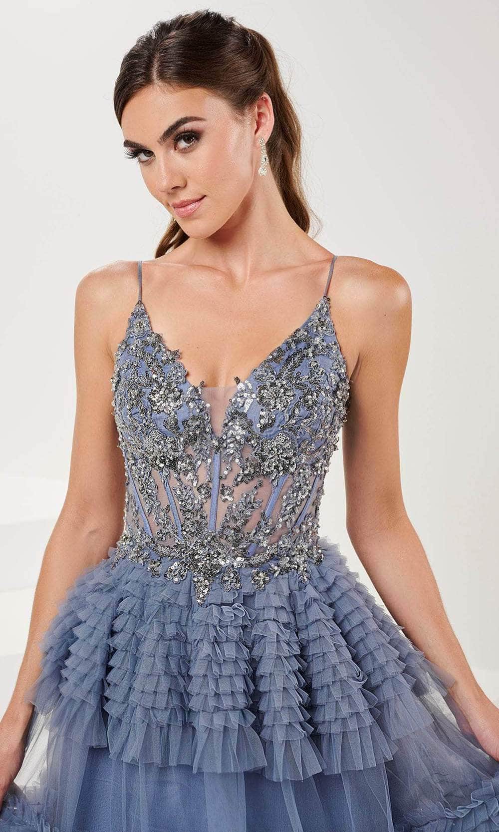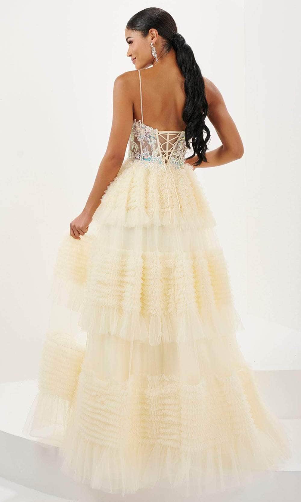 Satisfy your inner diva at your upcoming event when you arrive in this Tiffany Designs 16054 creation. Embellished with a tantalizing spectacle of sequins accenting the sheer corset boned bodice, this gown reveals spaghetti straps trailing down the v-neckline. Crafted with a sheer midrise back and nipped with a lace up design, the ruffle trimmed skirt forms an A-line silhouette with a sweep train. Glow with a sultry flair and styled with sophistication in this Tiffany Designs 16054 masterpiece. Models are wearing the Pale Yellow and Slate colors.