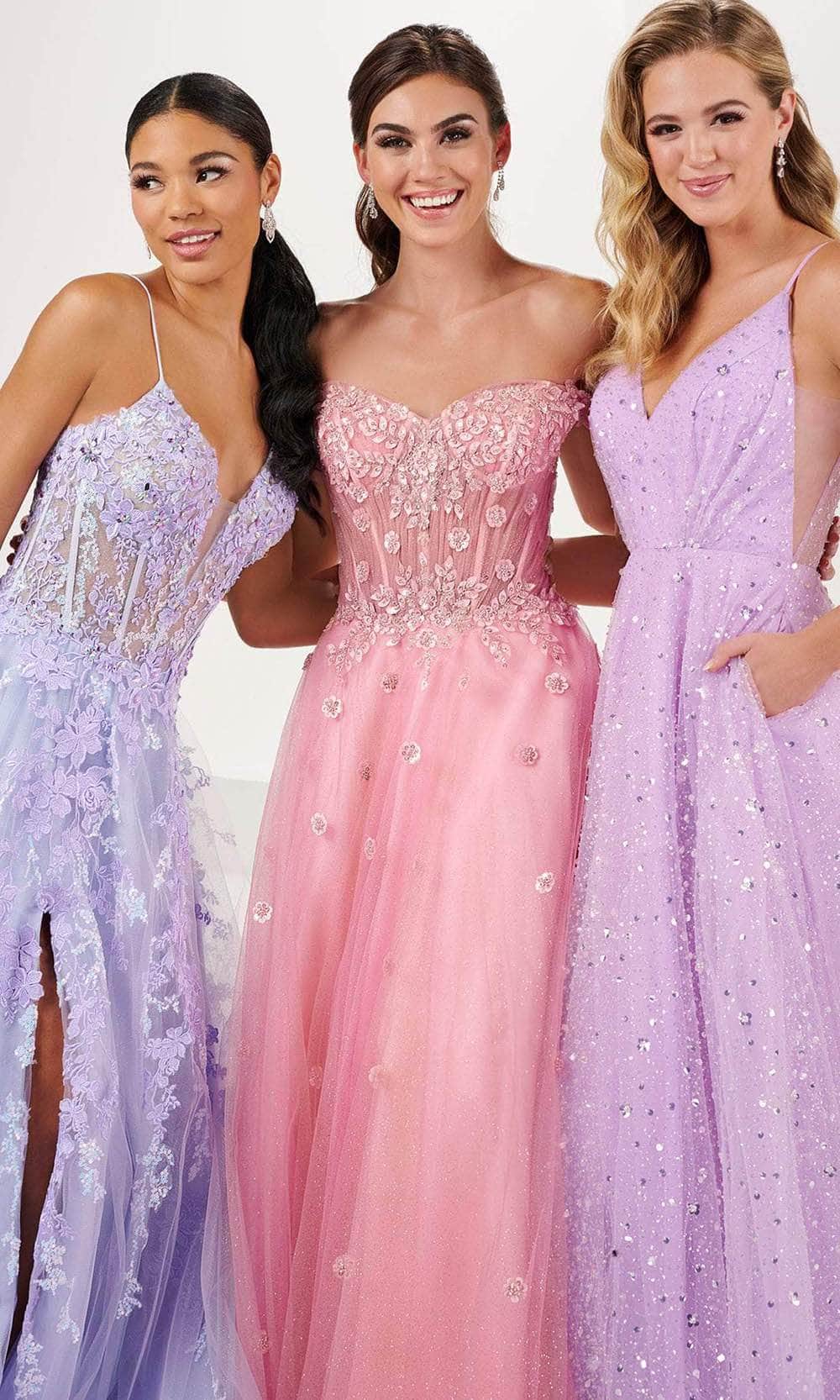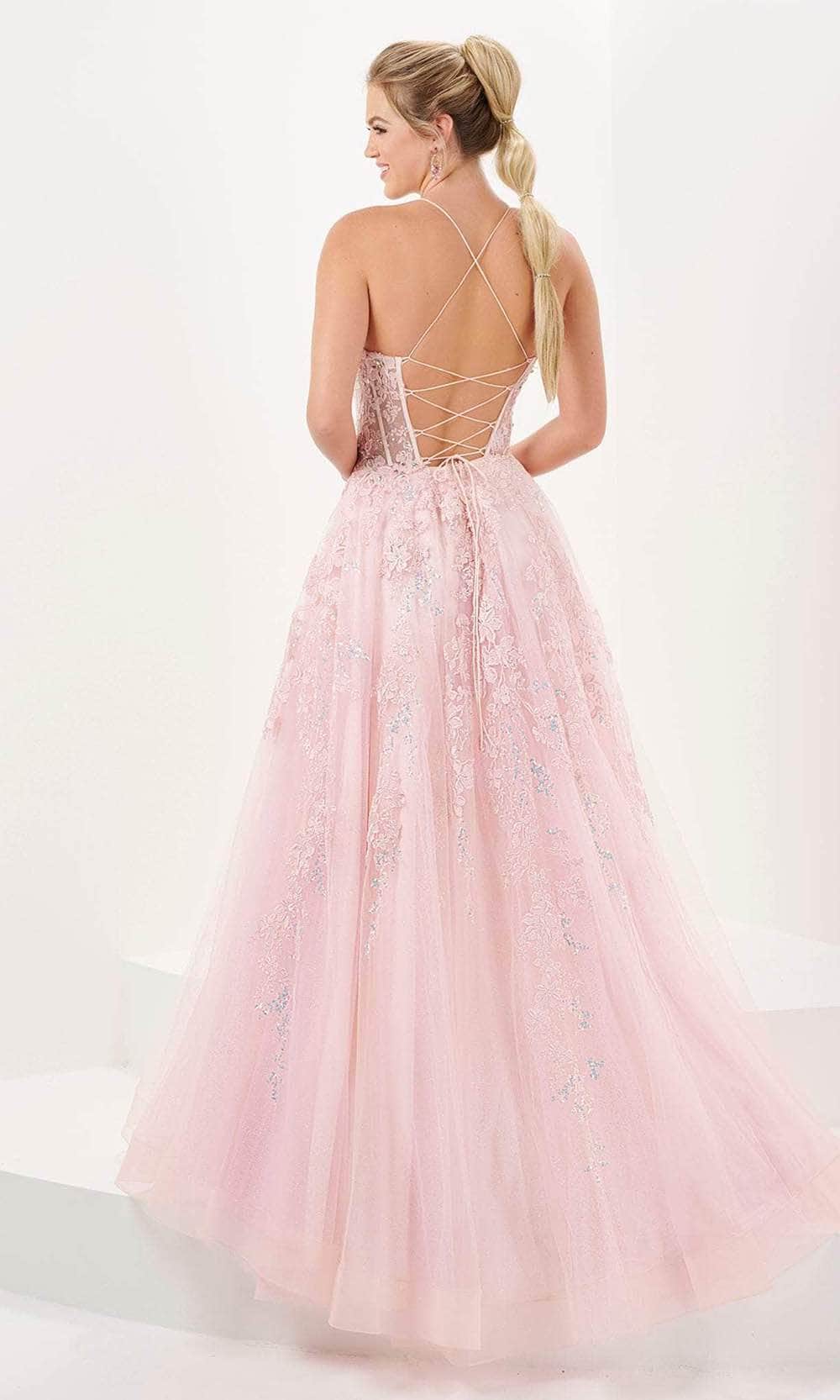 Exude an air of refined elegance and captivate the discerning eye in the exquisite Tiffany Designs 16056 creation. This ensemble boasts a deep v-neckline, accentuated by an illusion corset adorned with exposed boning. The exposed back accentuated by a crisscross lace-up closure. A trail of exquisite floral embellishments gracefully adorns the A-line tulle skirt, featuring a front side slit and a sweeping denouement. Make an appearance in this Tiffany Designs 16056 masterpiece and turn heads at your next special occasion. Models are wearing the Blush Pink and Lavender/Blue colors.