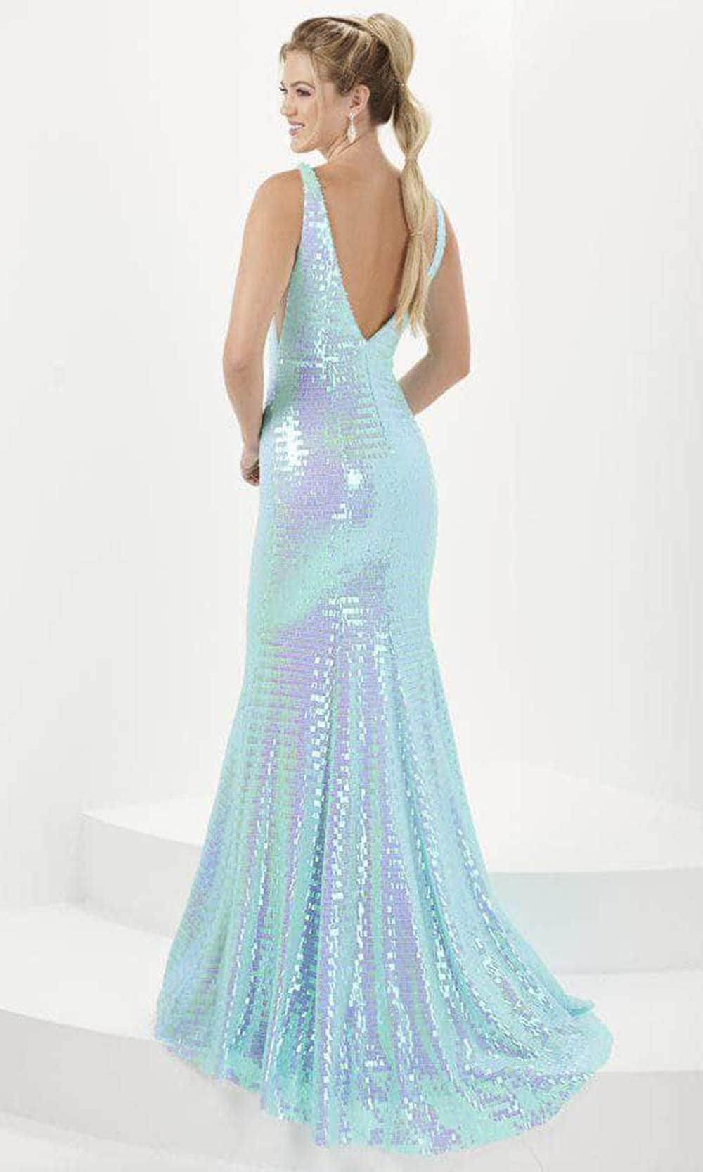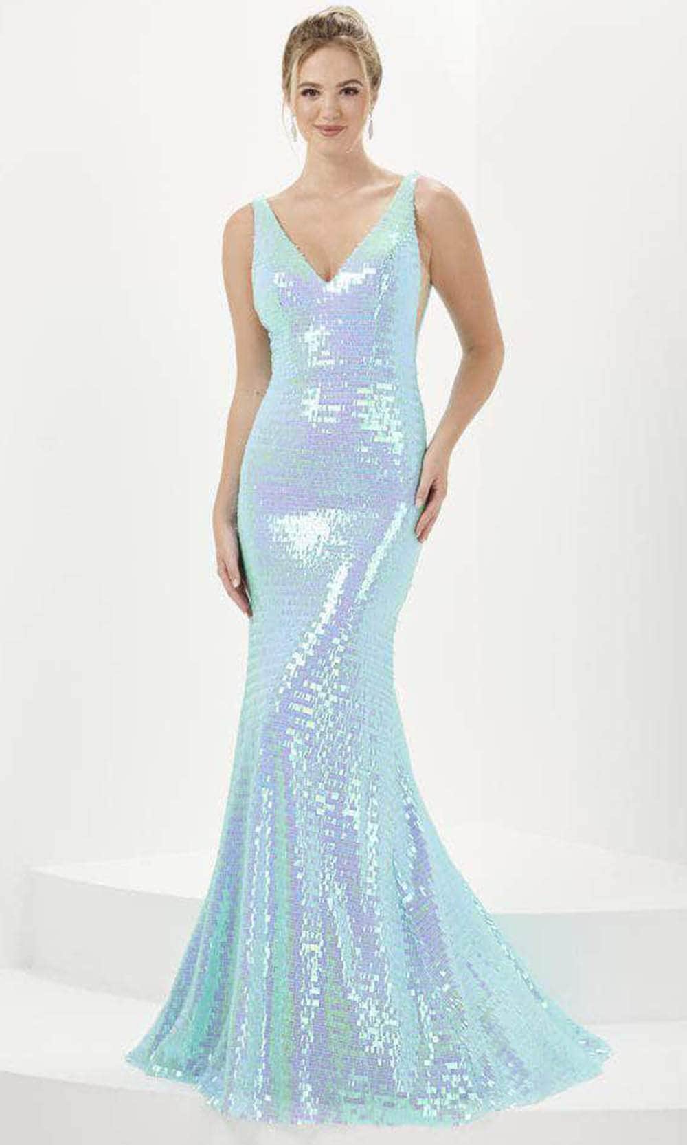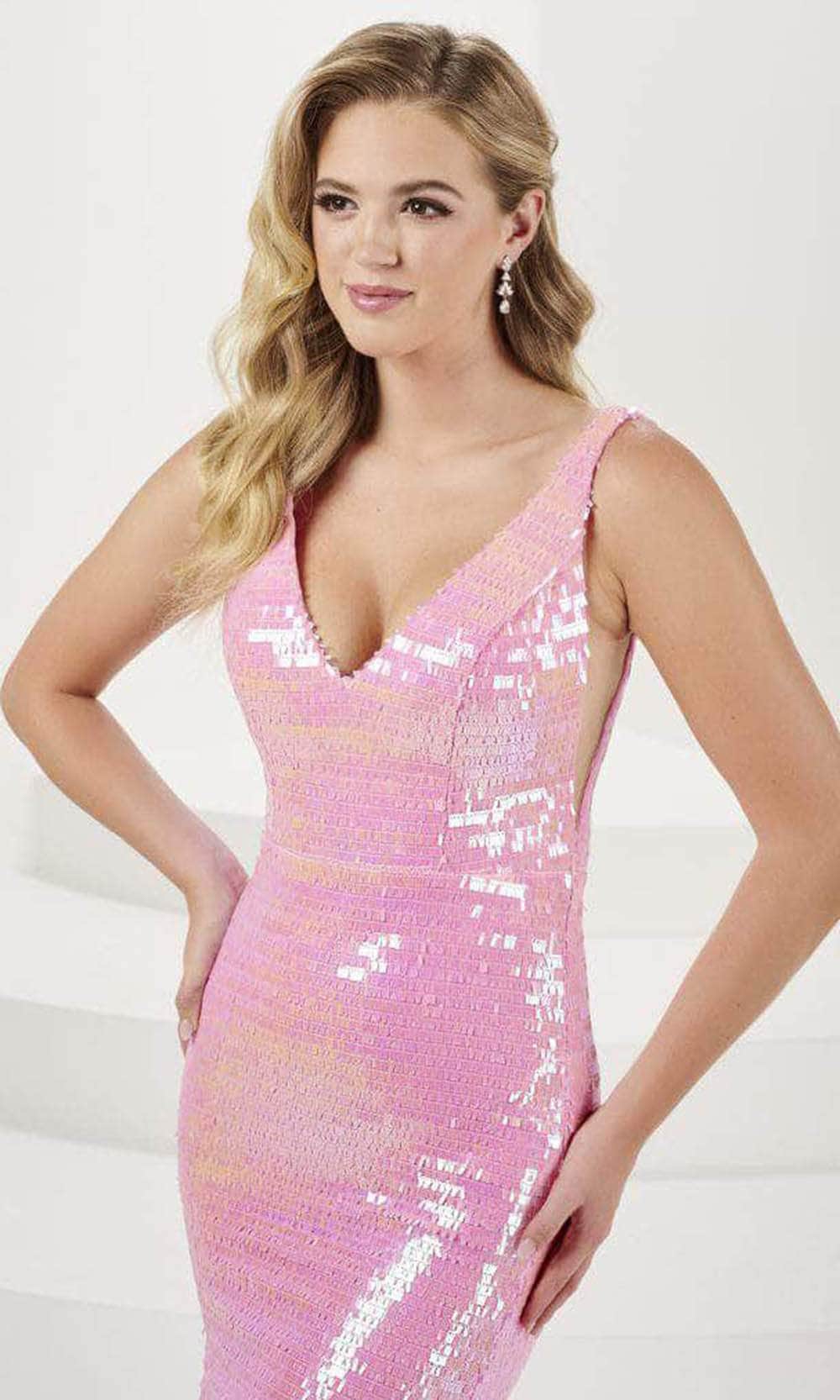 Step into the limelight and glow with elegance in this Tiffany Designs 16065 creations. Embellished with all-over micro fringe sequin, this sleeveless style will shimmer with every movement. It features a deep v-neckline, and plunging v-open back with convenient zipper closure to keep it in place. The side illusion inset gives you a stunning peek of skin while emphasizing your curves. The skirt forms a trumpet silhouette that dazzlingly glides to the floor and culminates with a stunning sweeping train. This Tiffany Designs 16065 long gown brings together all the essentials for a great look at prom or party! Models are wearing the Blush, Hot Pink, and Turquoise colors.
