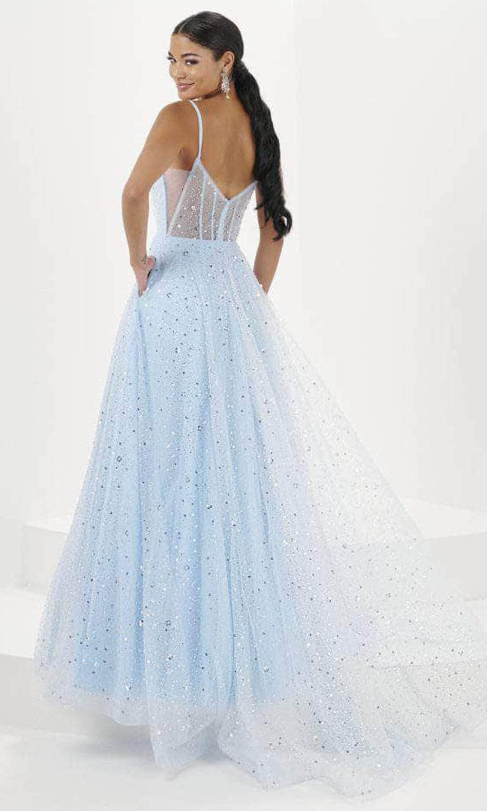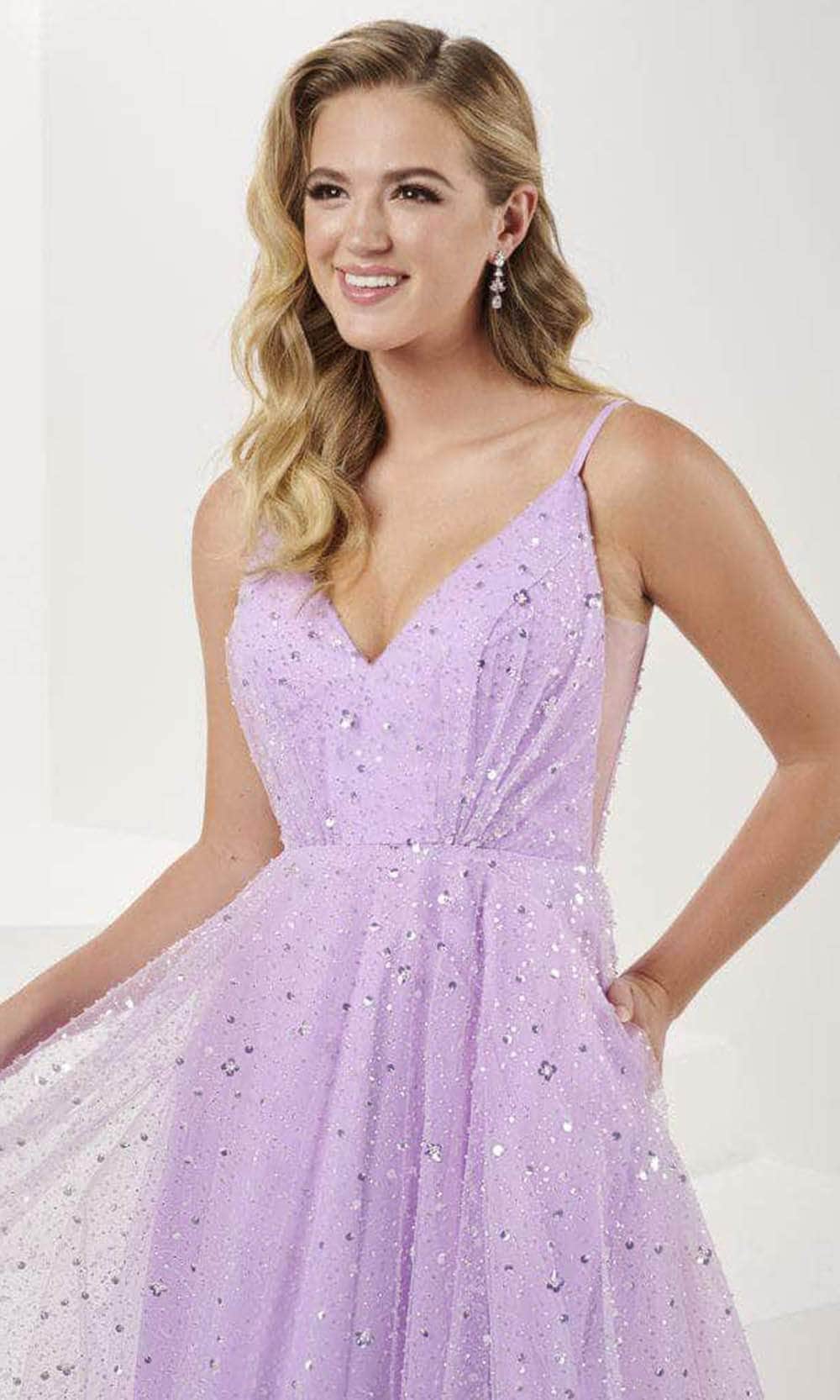 Get ready to wow the crowd wearing this lovely Tiffany Designs 16066 masterpiece. This sleeveless gown screams refinement and glamour, and it's completely covered in glittering sequins. Delicate spaghetti straps support the deep v-neckline, and the alluring illusion corset v-back has visible boning details. An illusion insert at the side waist will show off your curves. With side pockets to keep your stuff, the skirt creates an A-line silhouette that spills to the floor and sweeping train. Sparkle in beauty wearing this Tiffany Designs 16066 evening gown. Models are wearing the Pale Blue, and Lilac colors.