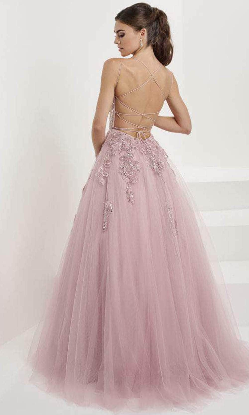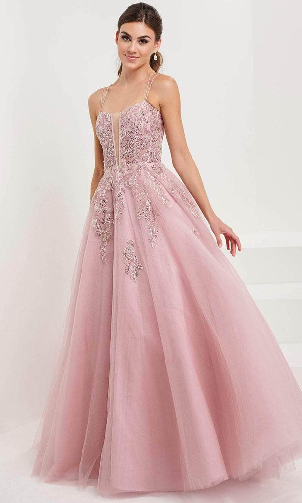 Look lovely in this timeless evening gown by Tiffany Designs 16072. Adorned with floral lace appliques and dazzling beading, this sleeveless ensemble is a must-have for any glamorous event. The illusion corset bodice has an exposed boning design, topped by a plunging v-neckline. A delicate dual spaghetti strap turn into an adjustable lace-up closure at the open back for an alluring and comfy fit. The tulle A-line skirt glides effortlessly to the full length A-line hem and extends with a slight sweeping train for a dramatic touch. This Tiffany Designs 16072 creation is truly a definition of glamour. Models are wearing the Dusty Rose, and Aqua colors.
