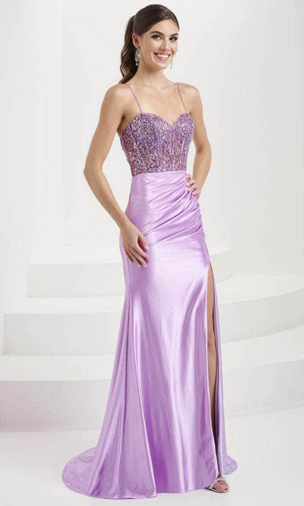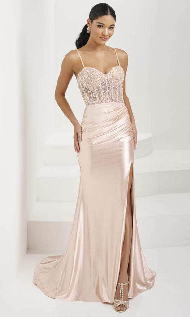 Capture the glamour as you walk on this attention-grabbing Tiffany Designs 16078 creation. The sleeveless gown has a sheer bodice adorned with floral embroidery and beadwork that adds an ethereal charm. It consists of a sweetheart neckline, and thin straps that delicately frame your shoulders. The back displays a straight mid-open design and center zipper closure. Highlighting your inherent beauty with its ruching design and front thigh-high slit, this shiny jersey skirt creates a sheath silhouette and smoothly cascades to the floor-sweeping train. This Tiffany Designs 16078 gown is specially designed to make that special occasion worth reminiscing. Models are wearing the Champagne, and Lilac colors.