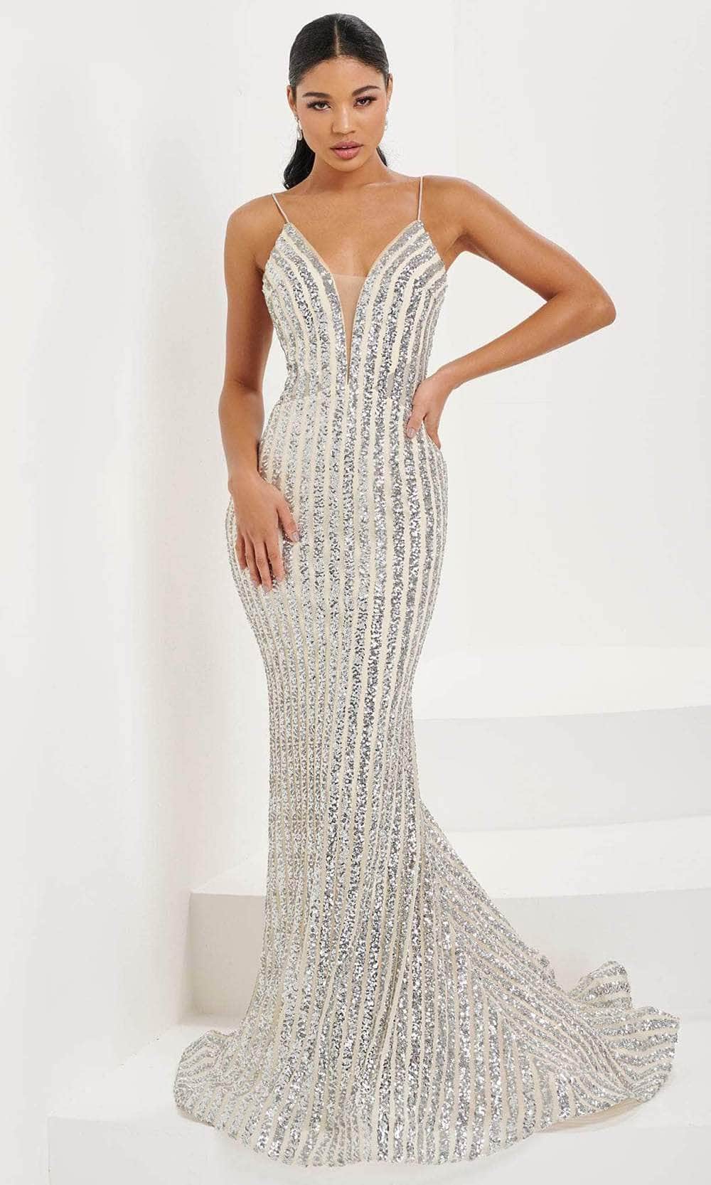 Fascinate everyone by the ethereal beauty of this Tiffany Designs 16092 masterpiece. Festooned with dazzling sequins arranged in a striped design, this sleeveless gown radiates opulence and charm. It boasts an illusion detail at the bust and side waist, a plunging v-neckline, and a spaghetti strap for support. With its mid-open detail, the back reveals a glimpse of skin. The sheath skirt accentuates your natural contours before finishing with a full length hem and sweeping train. This Tiffany Designs 16092 evening gown will make you sparkle like the star you are. Models are wearing the Navy, and Silver colors.