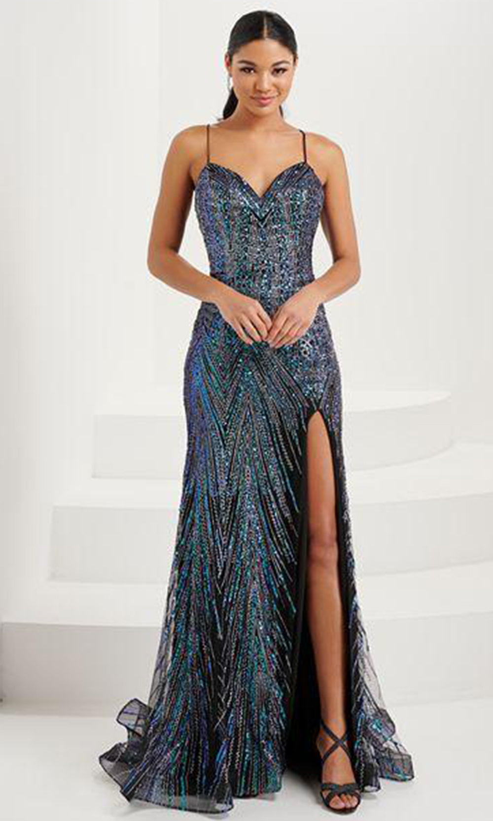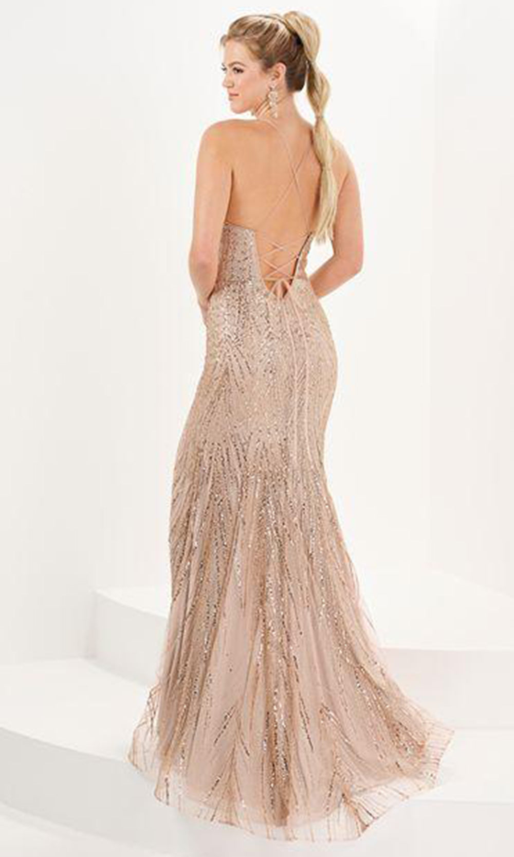 Be a queen of your own right in this extraordinary Tiffany Designs 16094 masterpiece. The sleeveless gown features a form-fitting bodice covered with brilliant sequins and beadings. It has dainty thin straps for support, a sweetheart neckline and a daring open back with a strappy lace-up closure for an adjustable fit. The sheath skirt flows beautifully over your curves and ends into an entrancing sweeping train. Make a lasting impression at your next event with this Tiffany Designs 16094 gown. Models are wearing the Black/Peacock, and Champagne/Gold colors.