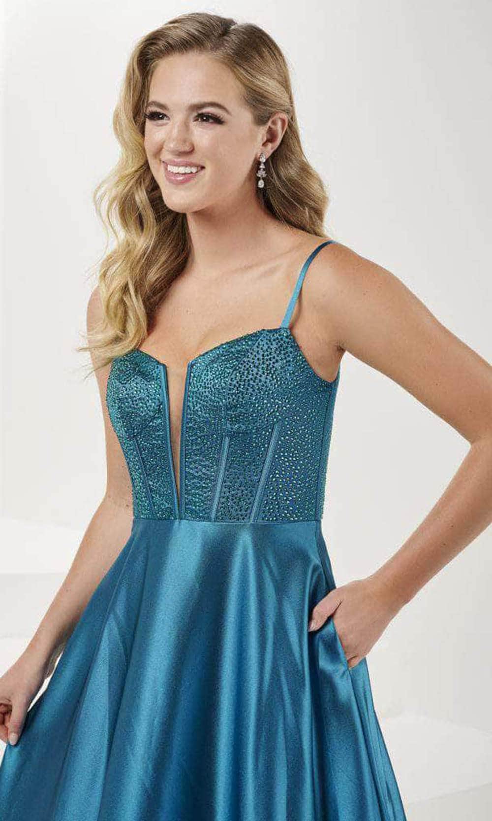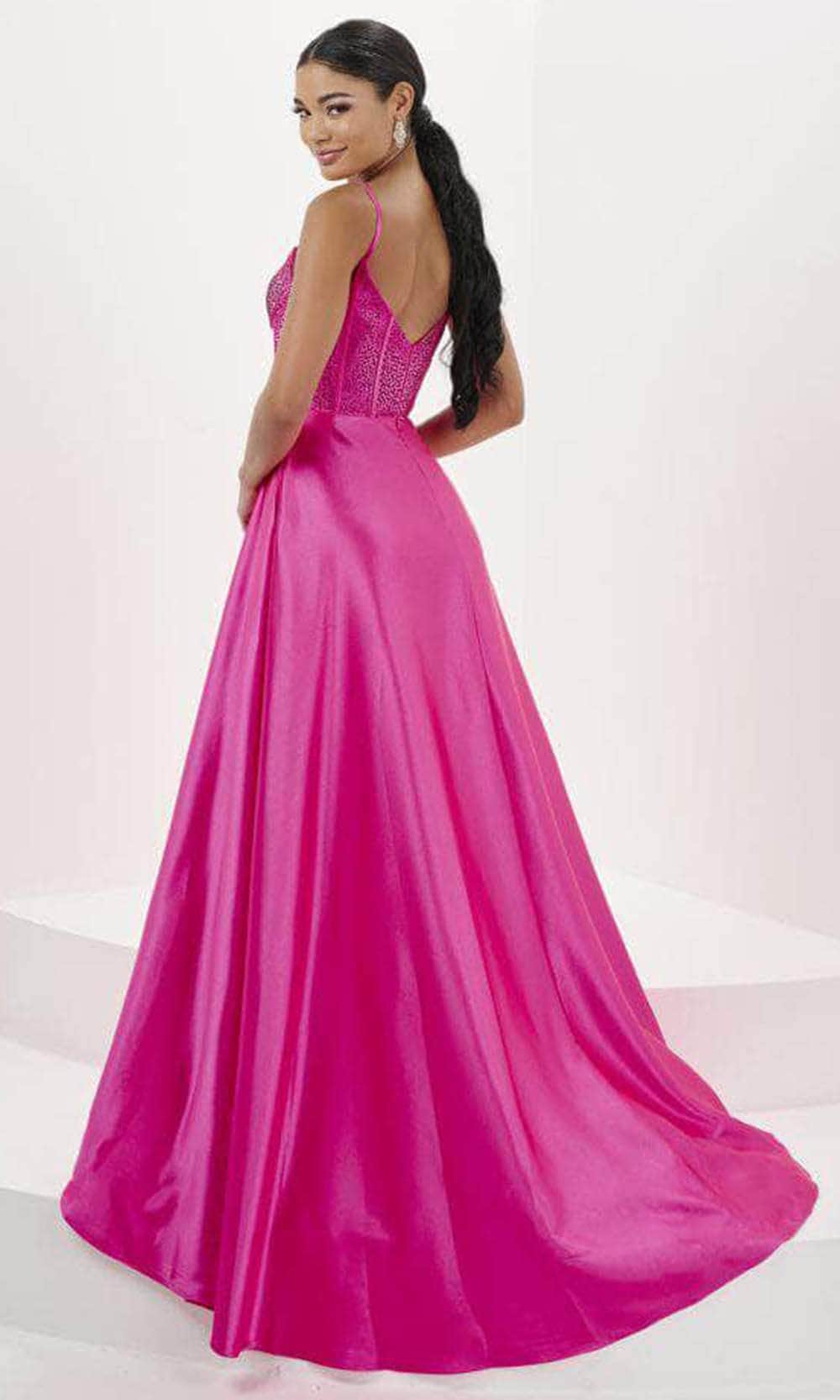 Make it a night unforgettable with this creation from Tiffany Designs 16101. Crafted from shiny jersey fabric, this sleeveless dress is embellished with dazzling heat-set stones and has a corset boning bodice for a flattering fit. The thin shoulder straps provide support, and the top includes a plunging v-neckline and a mid-open v-shaped back. With side pockets to keep your essentials and a dramatic sweep train, the skirt cascades to the floor in a stunning A-line silhouette. Capture the glamour as you walk on this Tiffany Designs 16101 dress Models are wearing the Hot Pink, Navy, and Peacock colors.