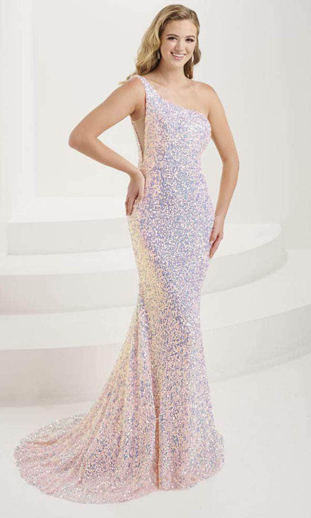 Create a special moment in this Tiffany Designs 16114 masterpiece. In this figure-flattering gown covered with all-over sequins, you'll be the star of the show. The one-shoulder bodice displays a wide shoulder strap with a mirrored asymmetrical neckline and mid-open back. The illusion inserts on the side waist add a hint of allure. The full length skirt is styled in a sheath silhouette and has a sweeping train for an elegant finishing touch. Be the embodiment of pure feminine flair in this radiant Tiffany Designs 16114 Models are wearing the Blush, Gold, and Mint colors.