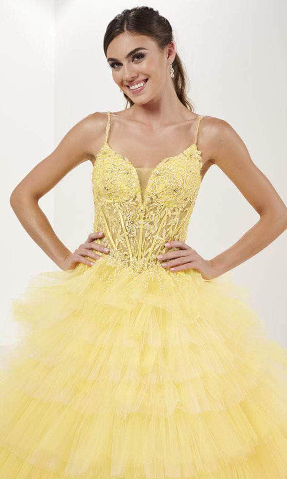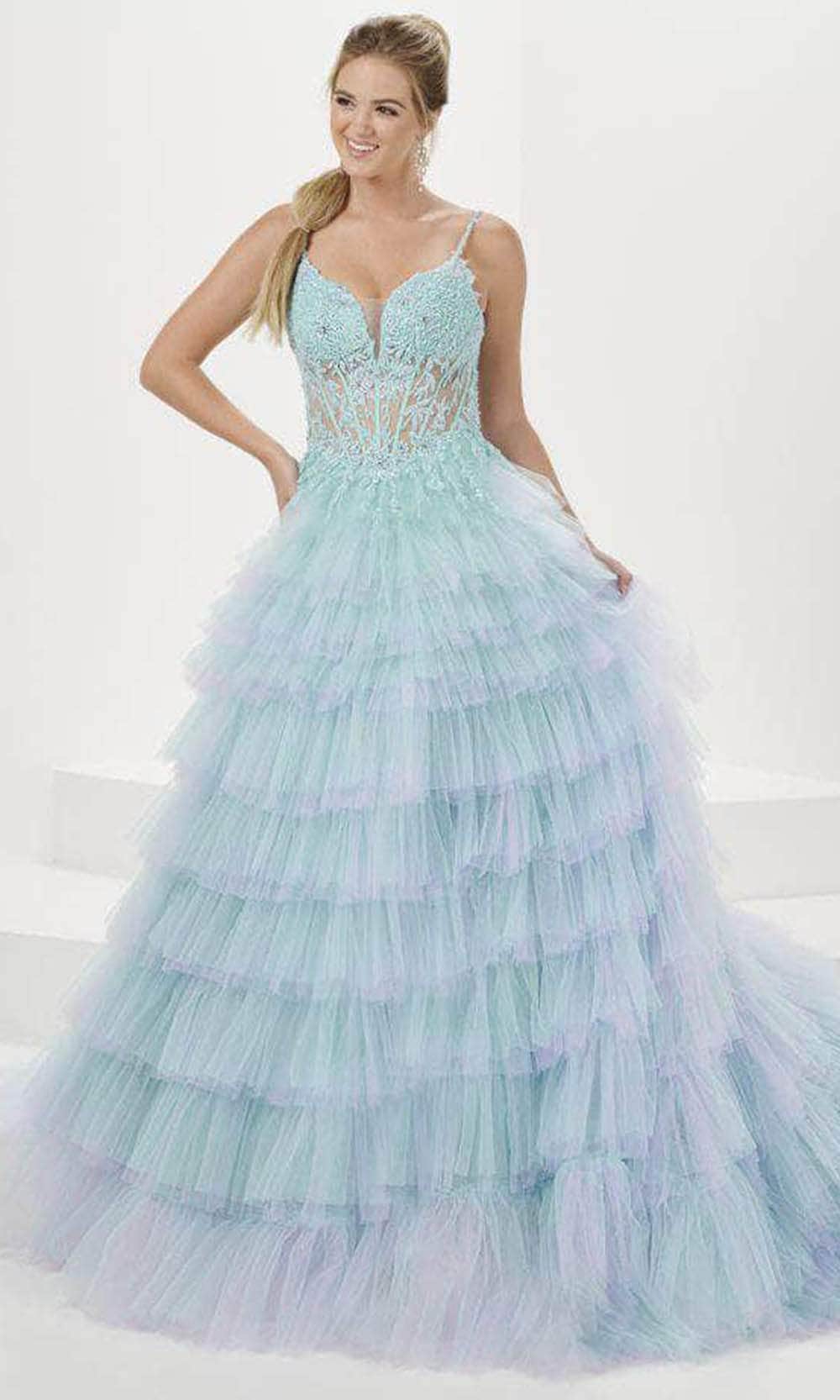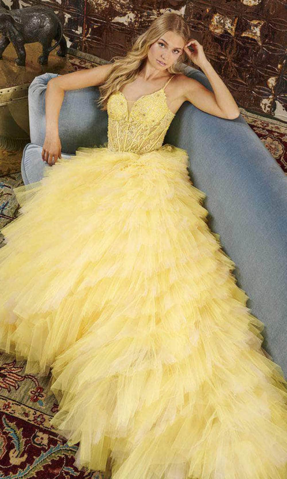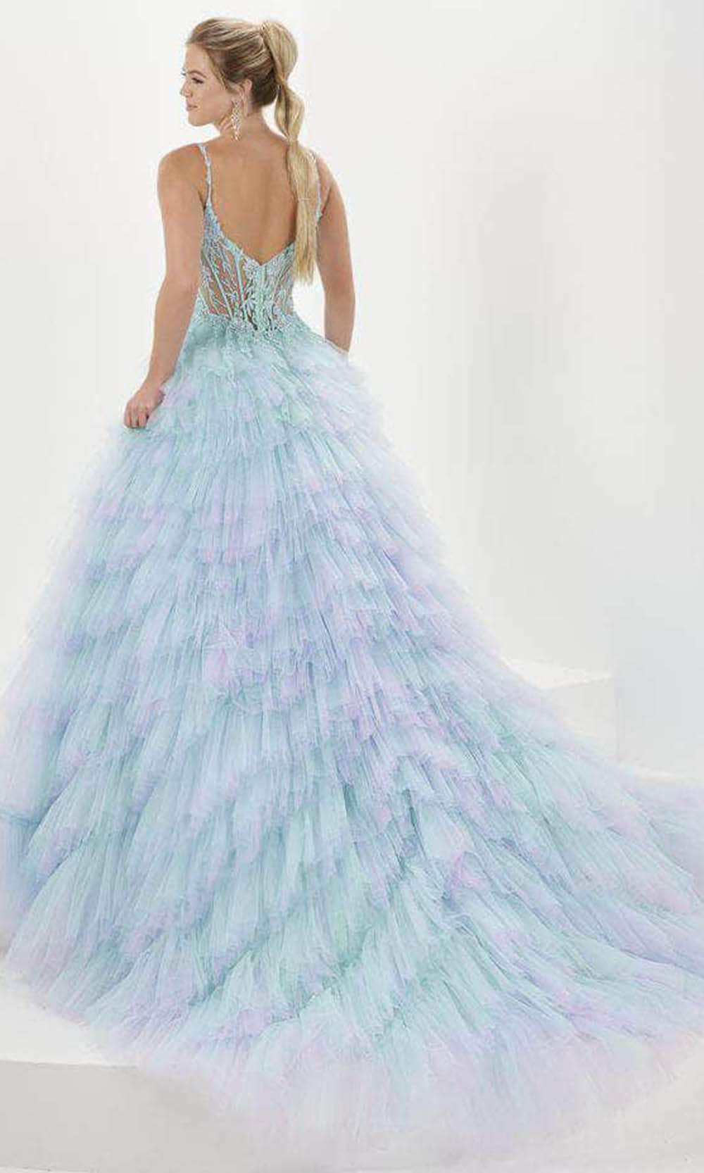 Clothe yourself in creative couture with this spectacularly mellifluous Tiffany Designs 16115 gown. Impeccably adorned with floral embroidery and beadings, this sleeveless gown exudes opulence and charm. The illusion corset bodice has an exposed boning design, with a plunging sweetheart neckline and an enticing v-open back. The amazing A-line skirt is made of ombre tulle and highlights the multi-tiered ruffle detailing for a dramatic touch. A sweep train adds a touch of extravagance to the overall look. You are a princess for an evening in this beautiful Tiffany Designs 16115. Models are wearing the Light Turquoise/Lavender, and Canary colors.