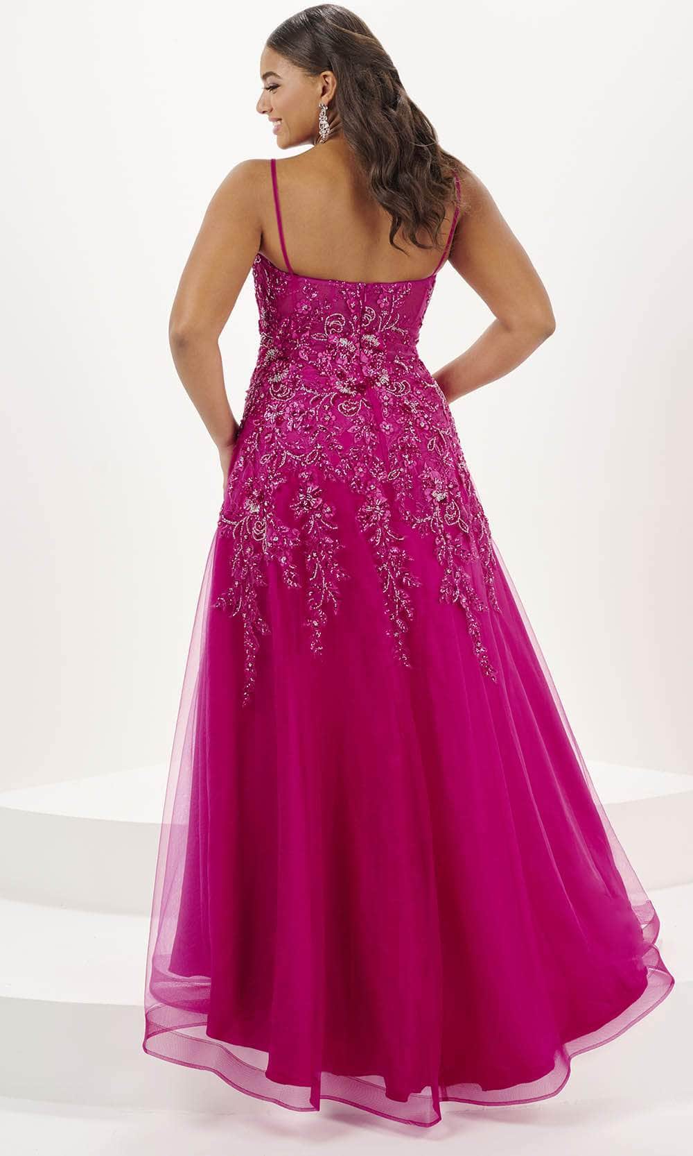 Capture everyone's attention in this pretty Tiffany Designs 16127 masterpiece. This sleeveless gown gives a timeless charm with its 3D floral lace applique and glistening beadwork adornment. The sweetheart neckline is held together by spaghetti straps for comfort. A front thigh-high slit and a straight mid-open back offer an alluring hint of skin. The A-line skirt is flattering on all figures and gracefully flows to the sweeping train. This Tiffany Designs 16127 gown is a must-have for any stunning event. Model is wearing the Dark Magenta color.