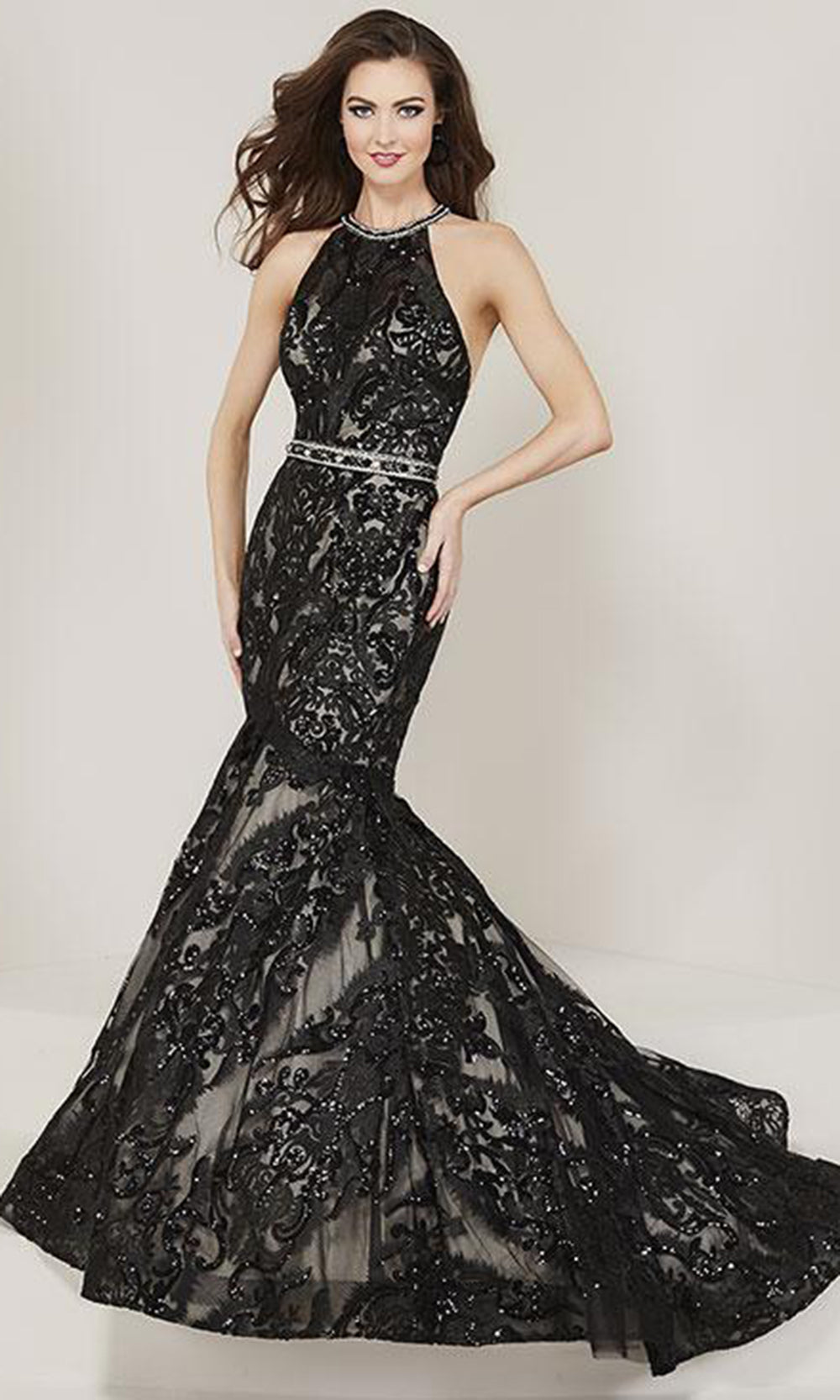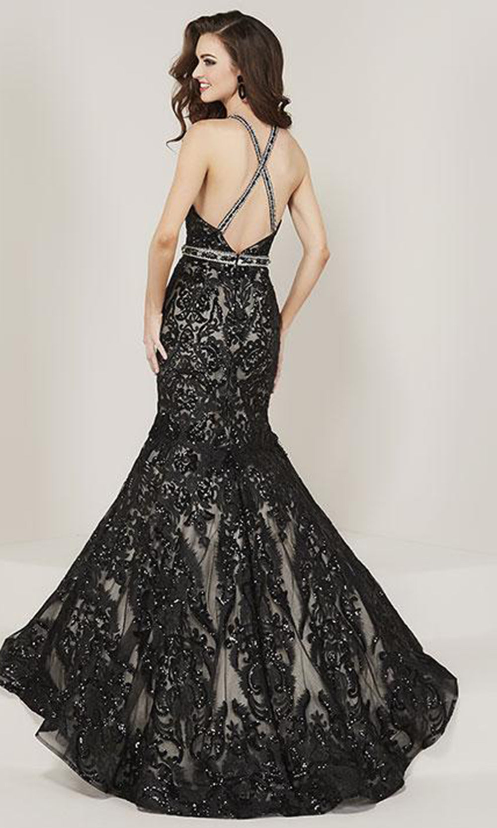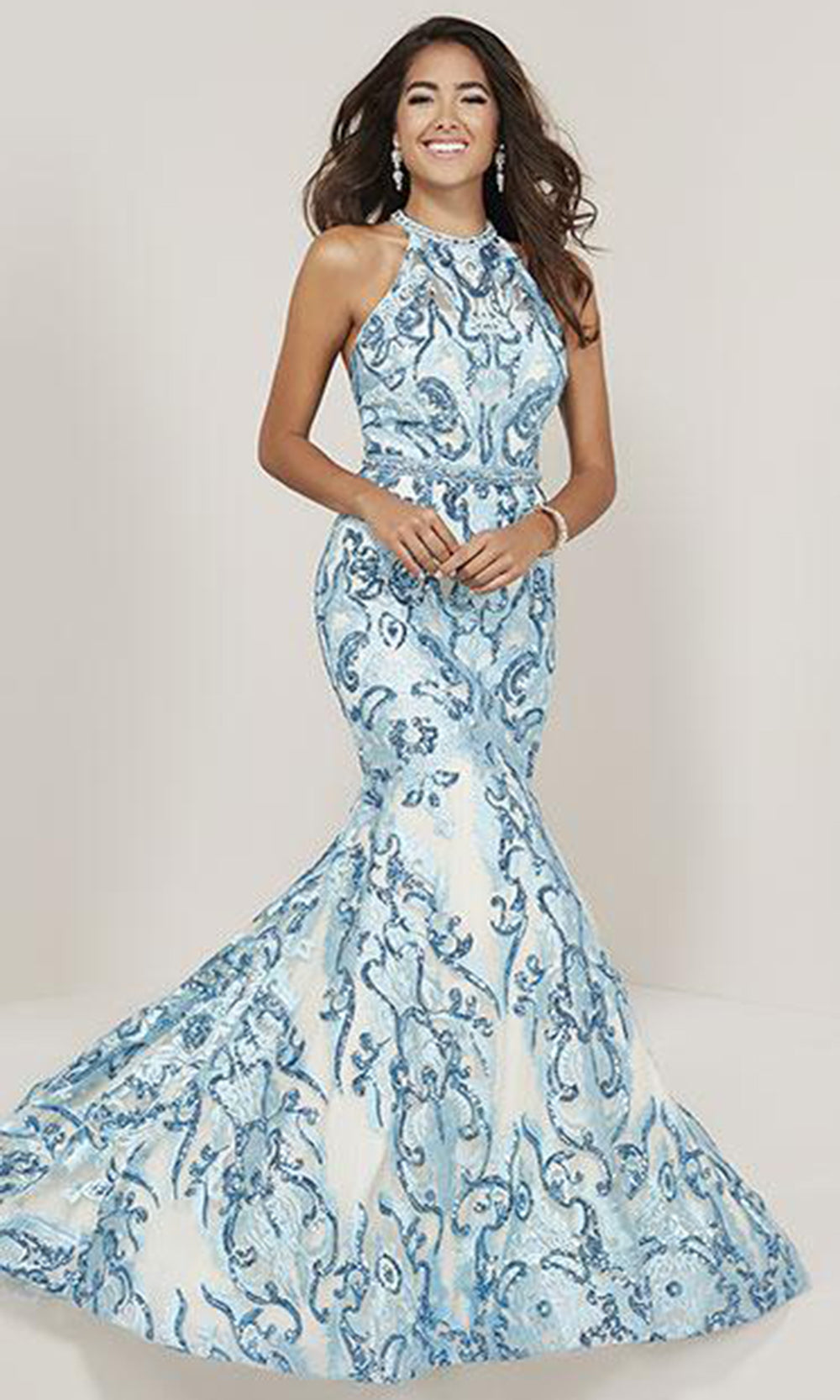 Walk in glamour and let all heads turn on you in this creation by Tiffany Designs 16336. Beautifully crafted in stunning patterns in sequin and lace, the fitted bodice features a halter neckline and beaded belt. Fitted through the waist and hips, the skirt flares dramatically to the floor highlighting a mermaid silhouette completed with a sweep train. The back reveals an open crisscross cut with a center zipper closure detail. Take their breath away with this gorgeous Tiffany Designs ensemble.