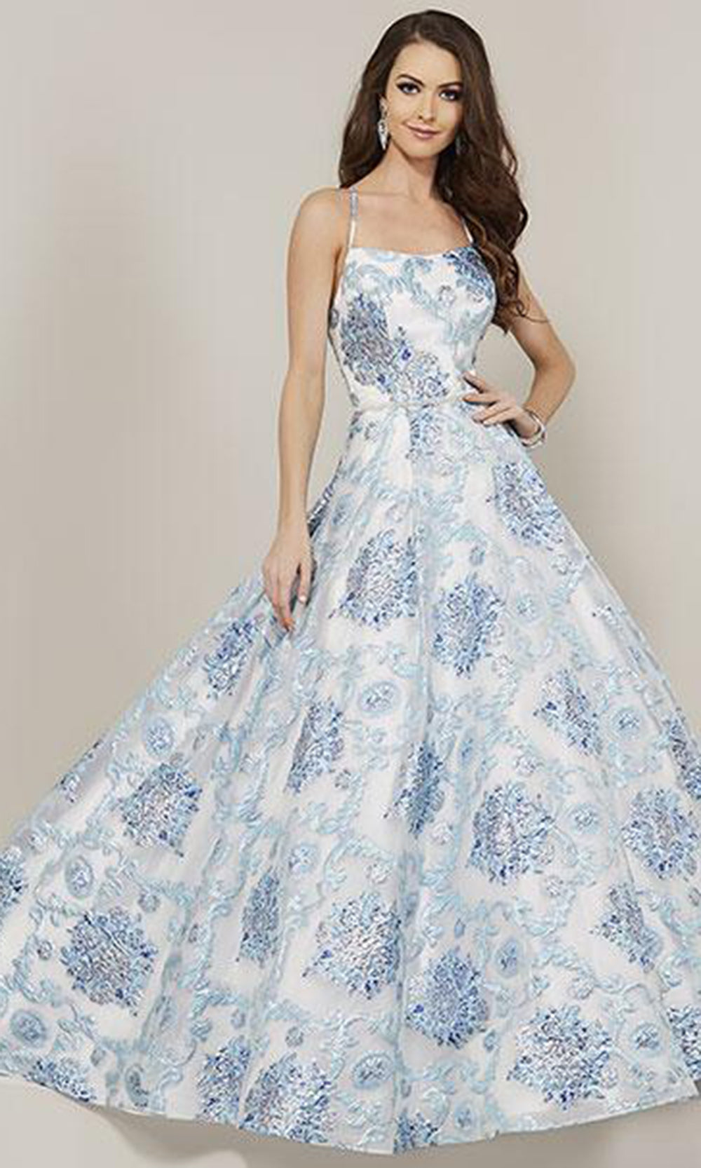 | Details: | Brocade Organza, Sleeveless, Spaghetti straps, Fitted bodice, Rhinestone belt, Side pockets, Back zipper, Crossed back, A-line skirt, Sweep train |