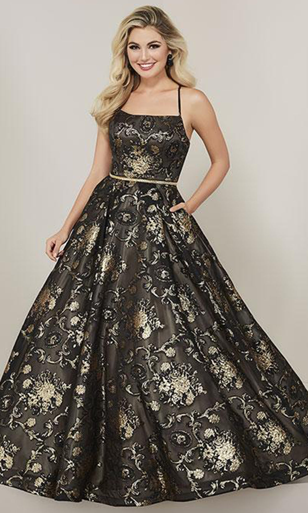 Wow everyone in this sophisticated dress by Tiffany Designs 16340. Fashions a sleeveless, scoop neckline with fitted bodice supported with spaghetti straps. The waist is accentuated with a rhinestone belt while the crossed back has a zipper closure. This brocade organza dress flourishes an A-line that runs at full length hem to a sweep train finish. You will definitely make a statement in every occasion when you wear this Tiffany Designs dress.