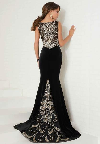 Sculpted with seams on a luxurious velvet fabric on a sleeveless bodice, this mesmerizing piece flourishes a sexy bateau neckline that naturally frames the shoulders. Lavishly embellished with a gorgeous spectacle of blossoming paisley beadwork on the illusion back, the sheath skirt fits alluringly before flaring in a stream of sleekly adorned illusion skirt inset panel.