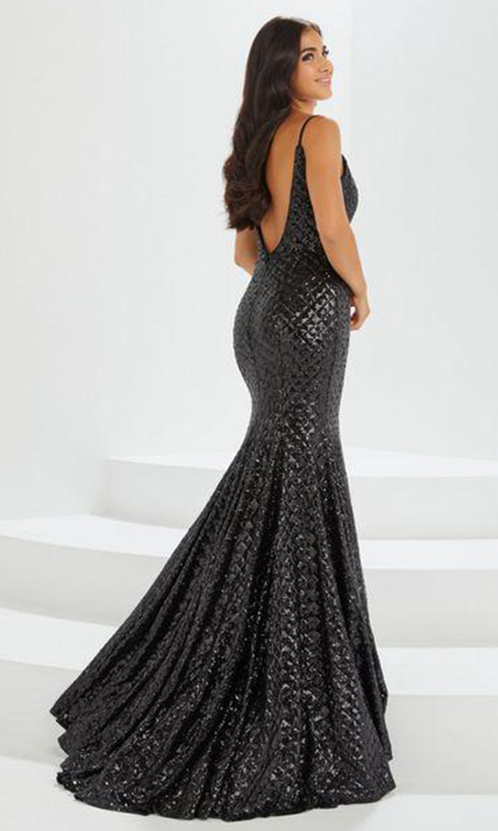 Get that glamorous casual feel by Tiffany Designs by Christina Wu 16022. This gown is fashioned from a novelty fabric and features a deep V-neckline, spaghetti straps, and sleeveless styling that is sure to captivate. The trumpet skirt finishes in a sweep train for a dramatic touch, and the fitted bodice has a V-back that is held by a hidden zipper fastening. This Tiffany Designs by Christina Wu 16022 creation is truly a definition of glamour. Model is wearing Black color.