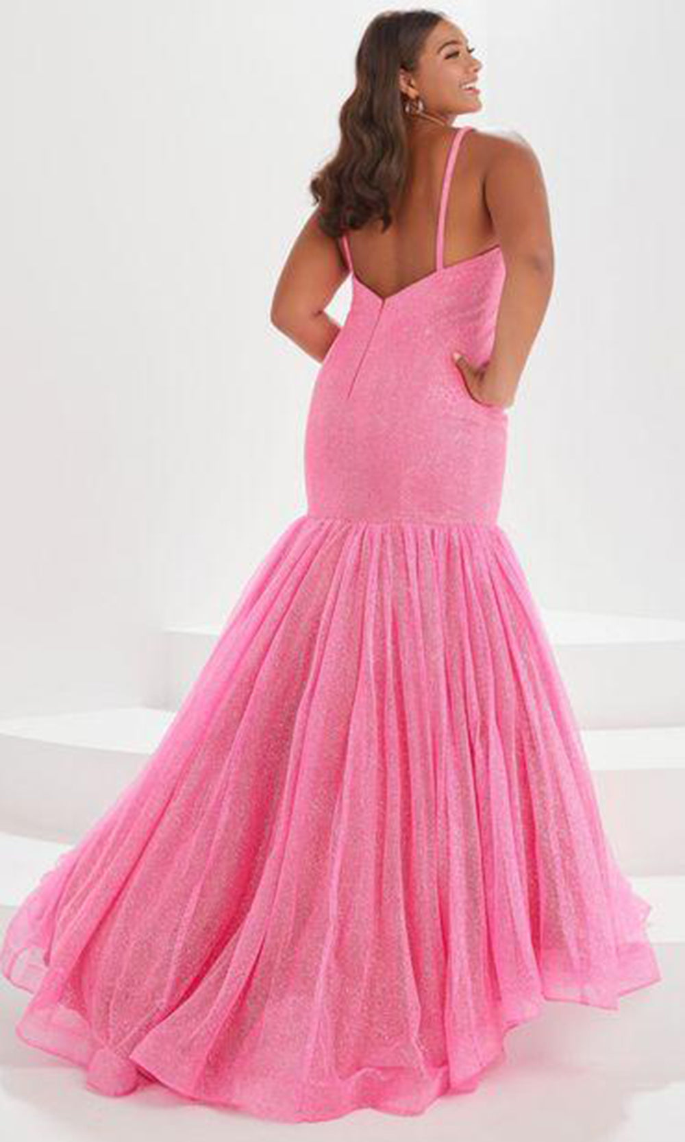 | Details: | Plunging V-neckline, Sleeveless, Glitter tulle, Center back zipper, Sweep train, Mesh insert, Floor-length |