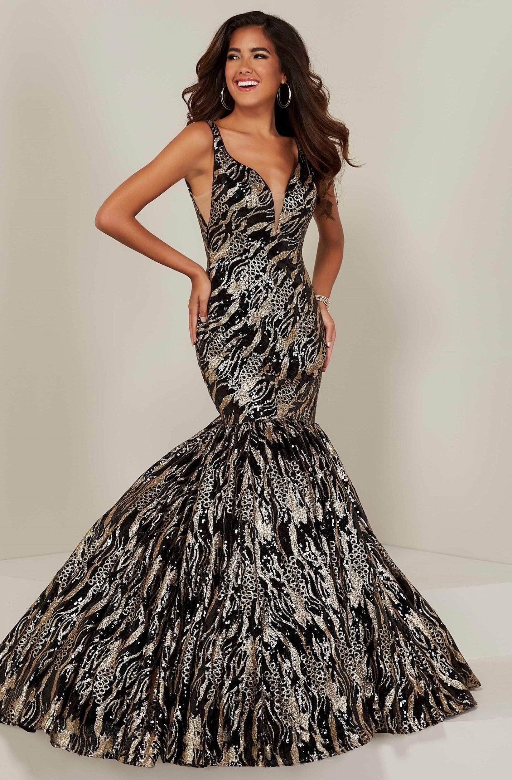 | Details: | Sequins, Sleeveless, Patterned Sequins, Sheer Modesty Inset, Deep V- Cut Sides, Low V-Open Back, Back Zipper Closure, Court Train |