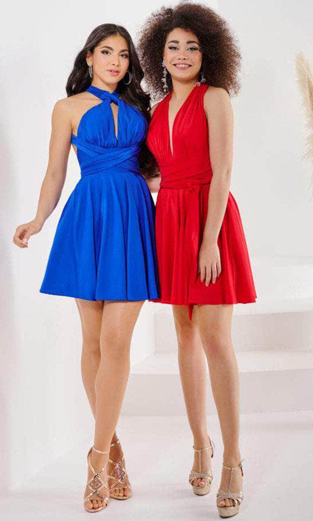 Dance the night away in this majestic Tiffany Homecoming by Christina Wu 27367 masterpiece. Tailored in the finest jersey fabric, this stunning dress features a sleeveless, deep V-neckline and open back with convertible shoulder straps that can simply be styled differently and endlessly. Defined with ruching detail and a wide waistband, the skirt flares a mid-thigh A-line silhouette. Be the ultimate belle of the party in this gorgeous cocktail dress from Tiffany Homecoming by Christina Wu. Models are wearing the Blush, Bright Blue, Burnt Orange, Red and Royal colors.