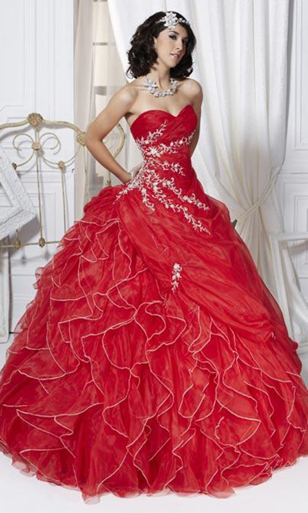 Walk into the ballroom and live the whimsical dream of being a regal vision in this luxurious Tiffany 56219 creation. Designed with intricate ruching flourishing from the fitted bust down to the hips, this charming piece showcases a strapless, sweetheart neckline atop a wrapped style bodice. Shimmering jewels are arranged to mimic a lush trailing vine accenting one side of this ensemble. Gorgeously parading a myriad of sumptuous ruffles, a sheer pleated sash embraces the voluminous skirt as refine jewels gathers and accentuates it. With lavish waves flowing in a stunning cascade, the ballgown is set to a stunning full length hemline. Be at the front and center of your very own fairy tale as you do this fabulous Tiffany masterpiece. Models are wearing the Red/Silver and White/Silver colors.