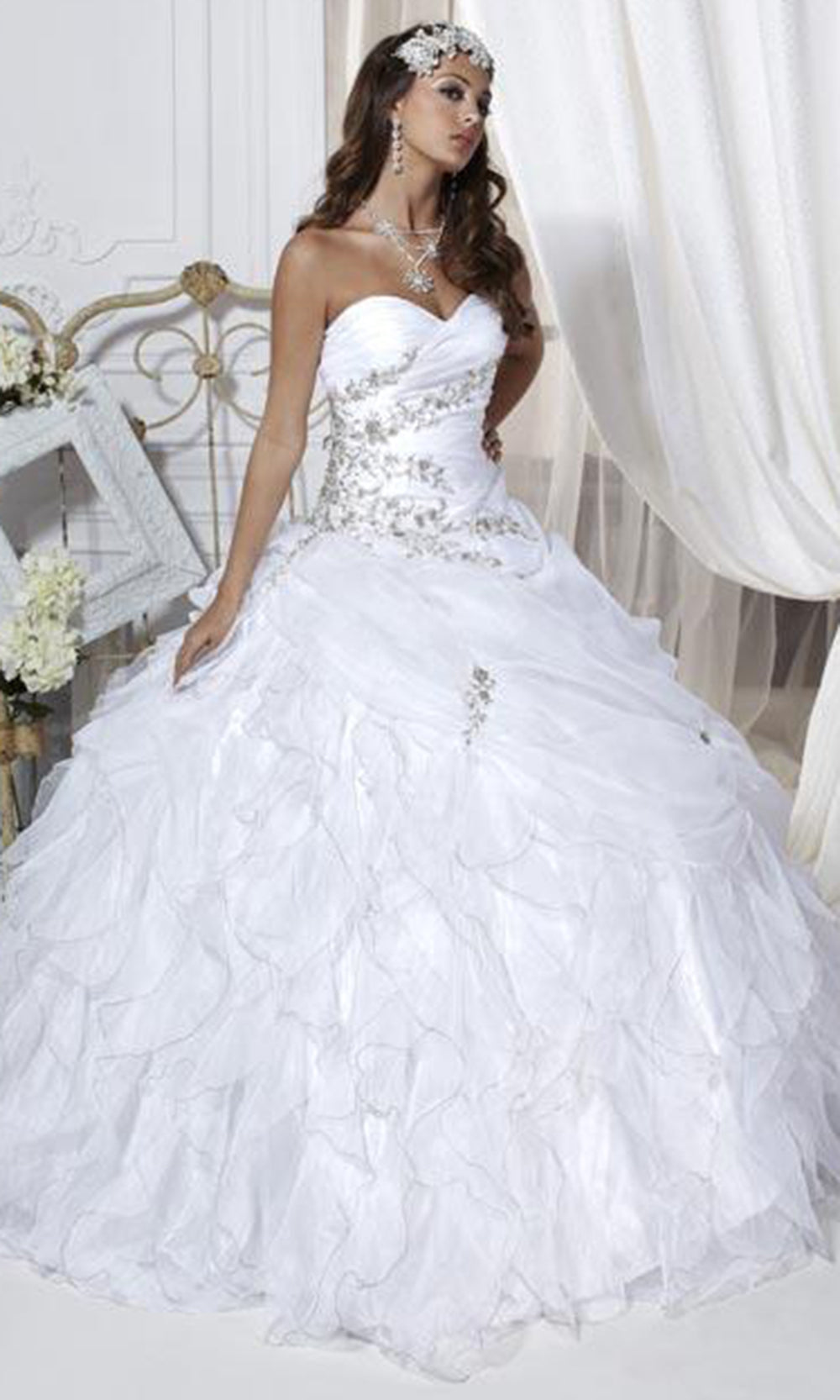 | Details: | Strapless, Bejeweled Vine Motif, Ruched Bodice, Rhinestones, Mid-Open Back, Pick Up Skirt, Layered Ruffles, Sash, Full Length Hem |