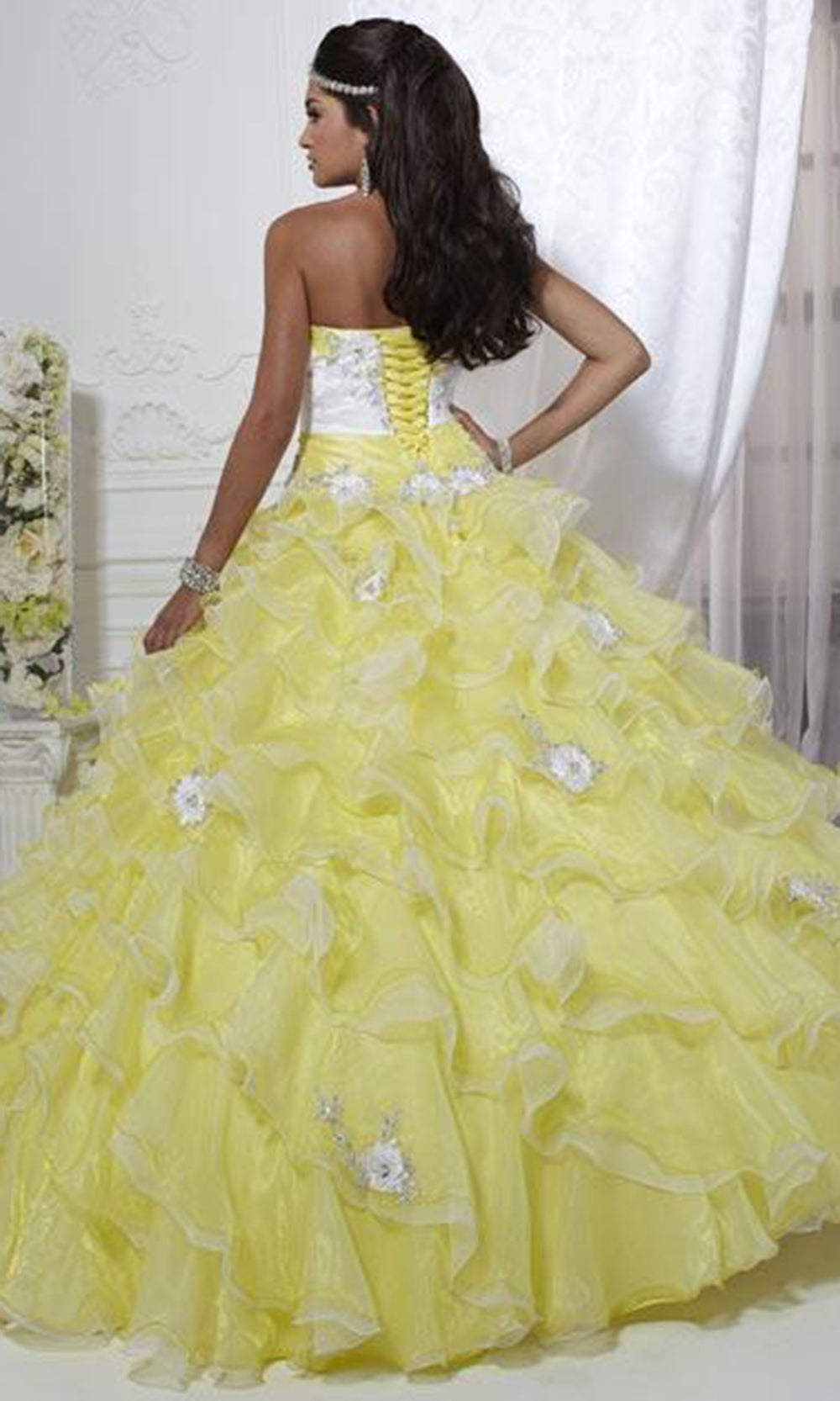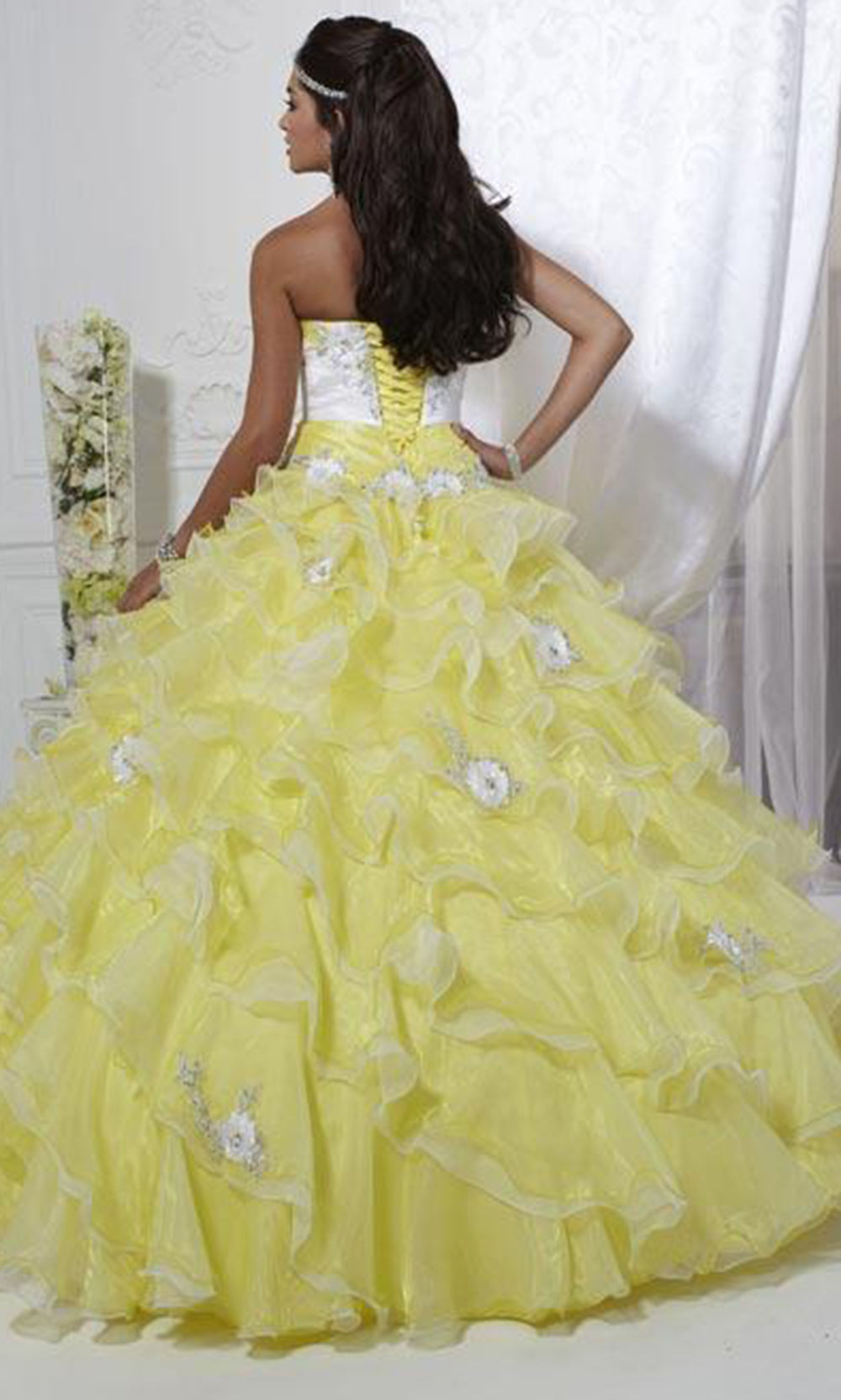 | Details: | Strapless, Corset Lace Up Detail, Multi-Tiered Ruffles, Pleated Waist, Mid-Open Back, Two-Tones, Floral Appliques, Crystals and Beads, Full Length Hem |