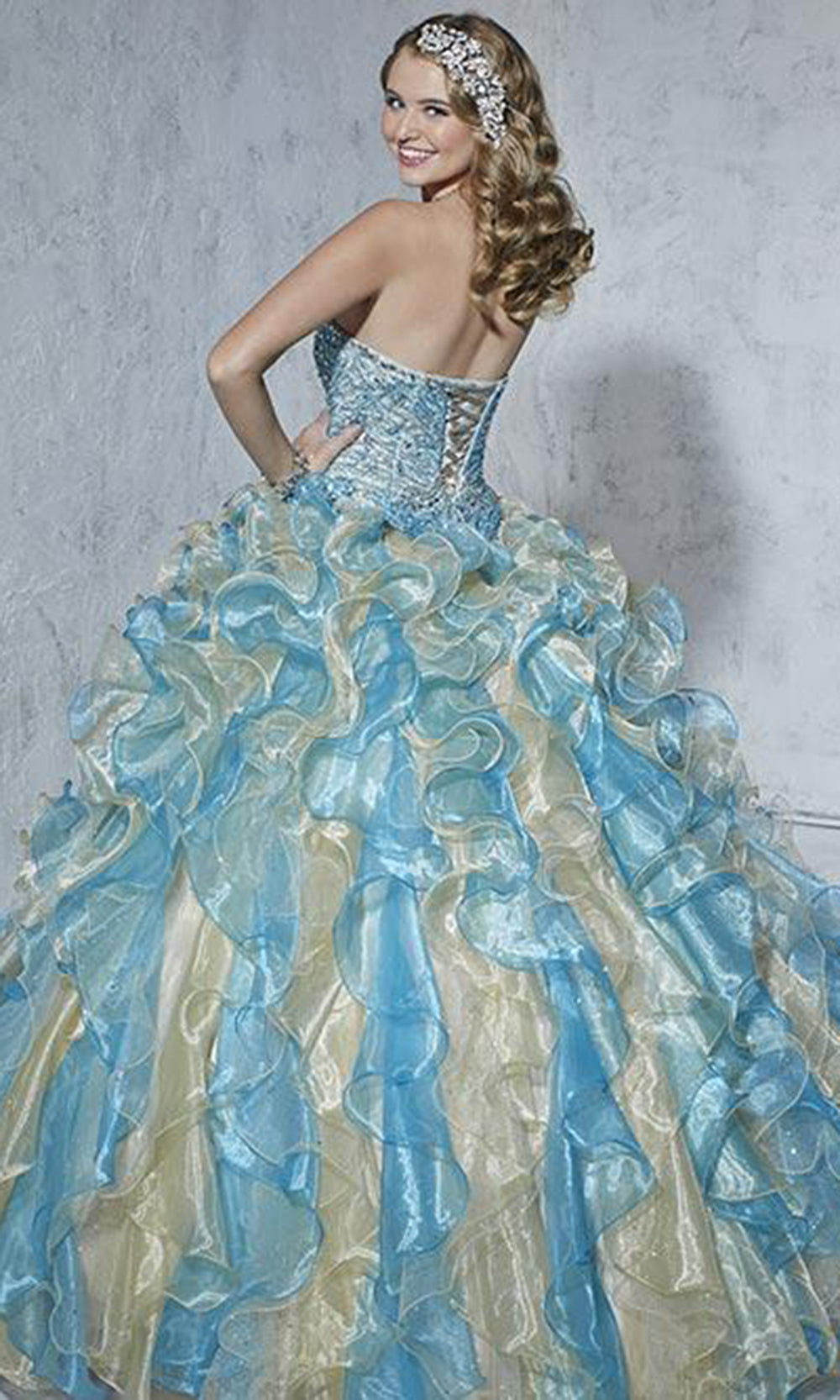 Flaunt your flair in this colorful gown from Tiffany 56251. The strapless sweetheart top is decked with bejeweled accents. Rainbow ruffles make up the tiered floor length skirt. This dimensional style flares to a ballgown effect for an amazing party dress to wear. This multicolored gown brings the night to life. This Tiffany gown style is a sure standout on your next evening social event. Model is wearing Turquoise/Champagne color.
