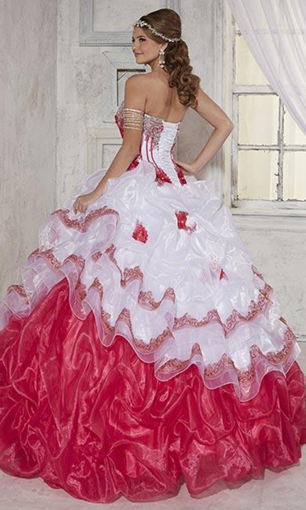 Capture that striking presence and get their attention in Tiffany 56255. Brandishes in a strapless, sweetheart neckline with corset bodice styled with embroidery and detailed beading. The back has a lace up closure while the floor length Ballgown skirt is lavishly styled with embellishments and ruffles. You are princess for an evening in this beautiful Tiffany design. Model is wearing White/Fuchsia color.