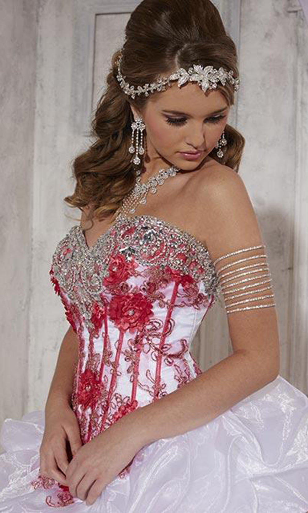 | Details: | Strapless, Corset bodice with boning, Beading, Embroidery, Lace up back, Ruffles, Ballgown skirt |