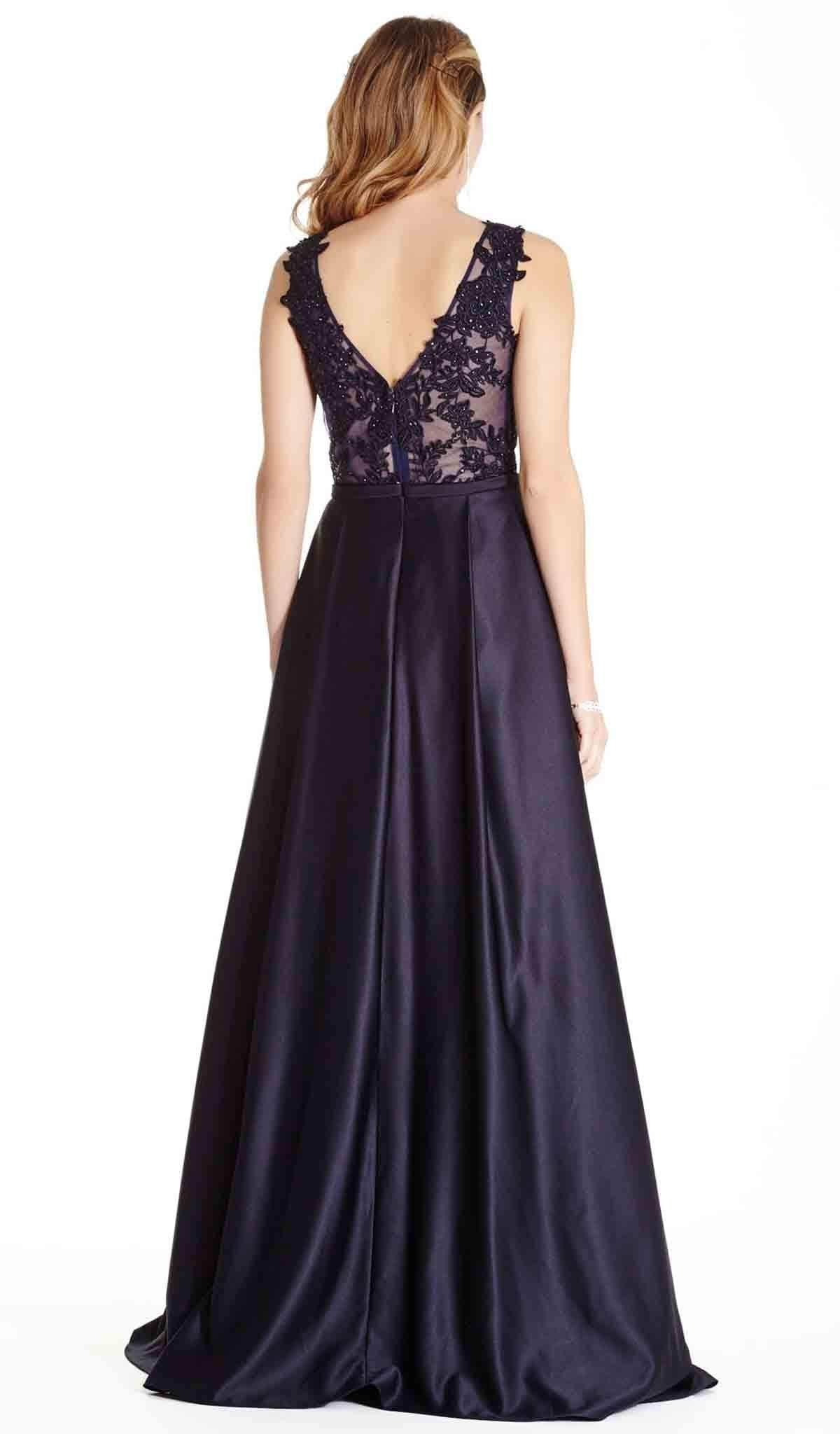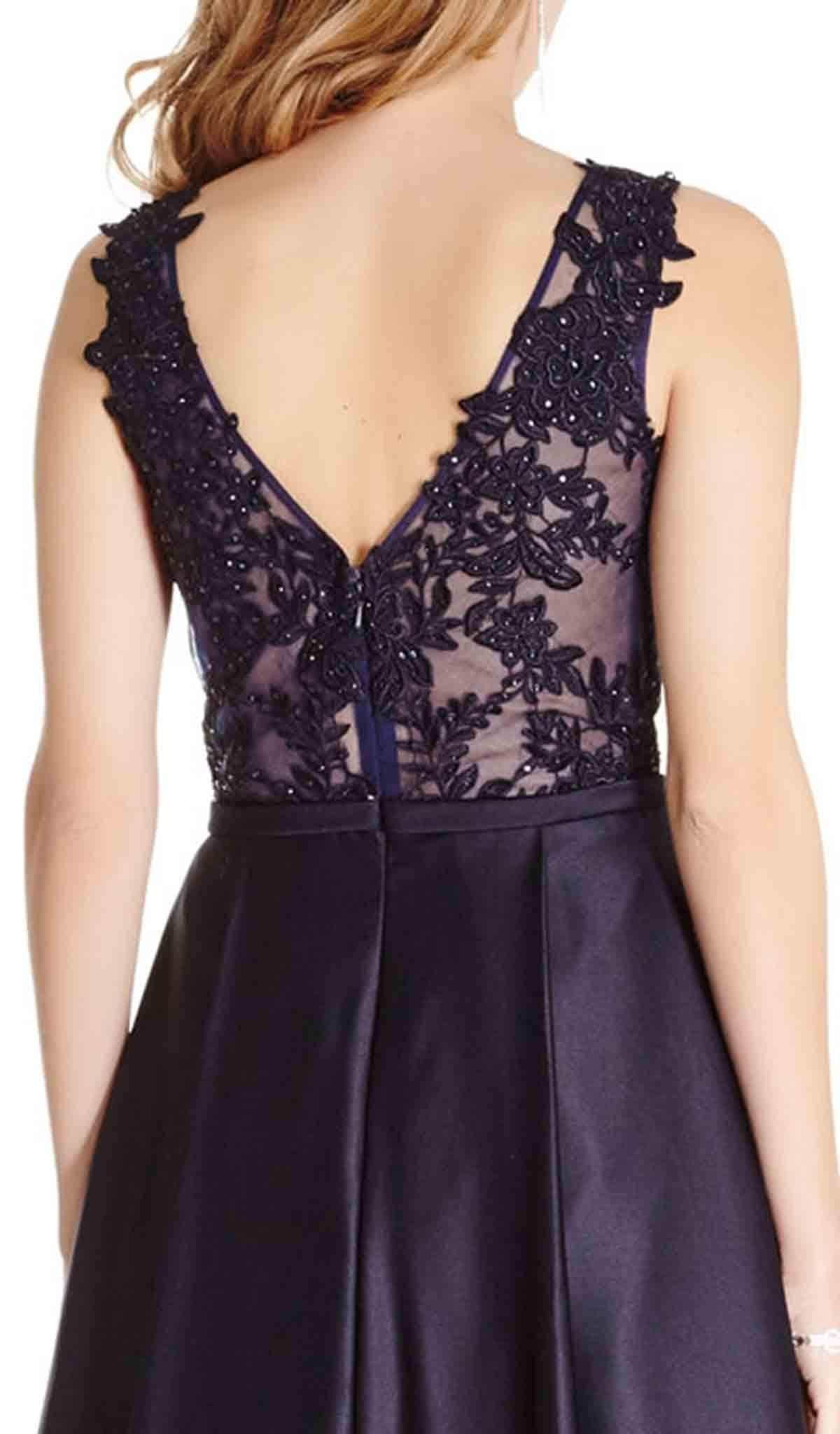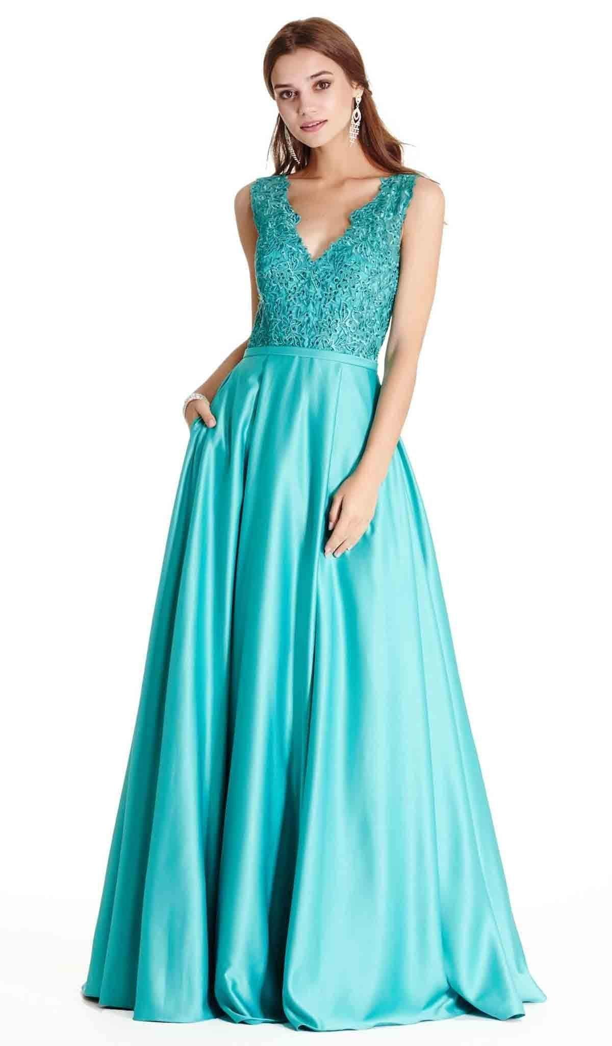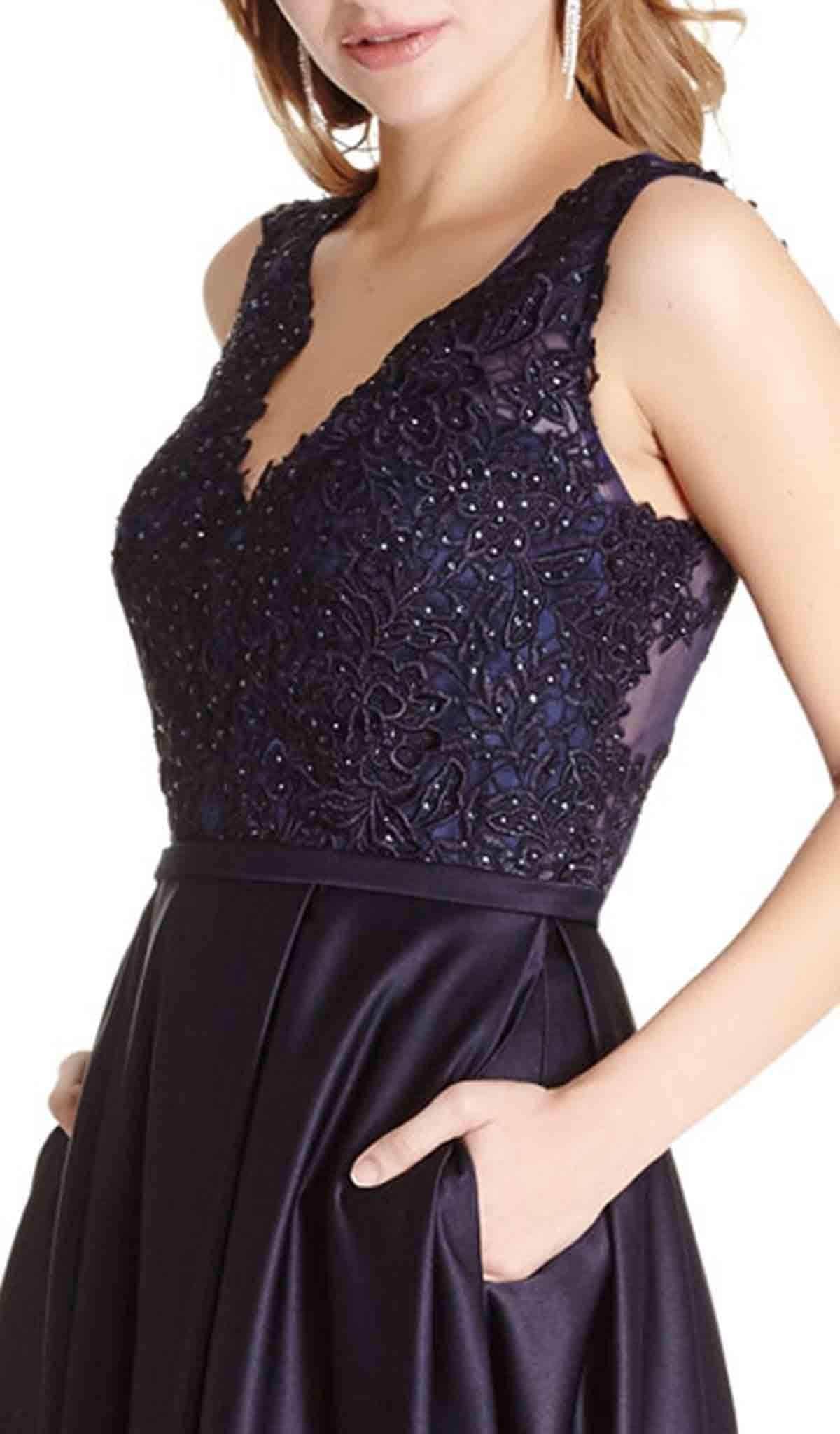 Look ethereal and enchanting in this formal evening dress from Trevi Collection L1792. Features a sleeveless, V-neckline with fitted bodice designed with beaded lace. The back has a low V-cut and a zipper closure. The waist is cinched in a thin belt and begins a full length A-line skirt with pockets and sweep train. Show your sophisticated sense of style in this Trevi Collection dress.
