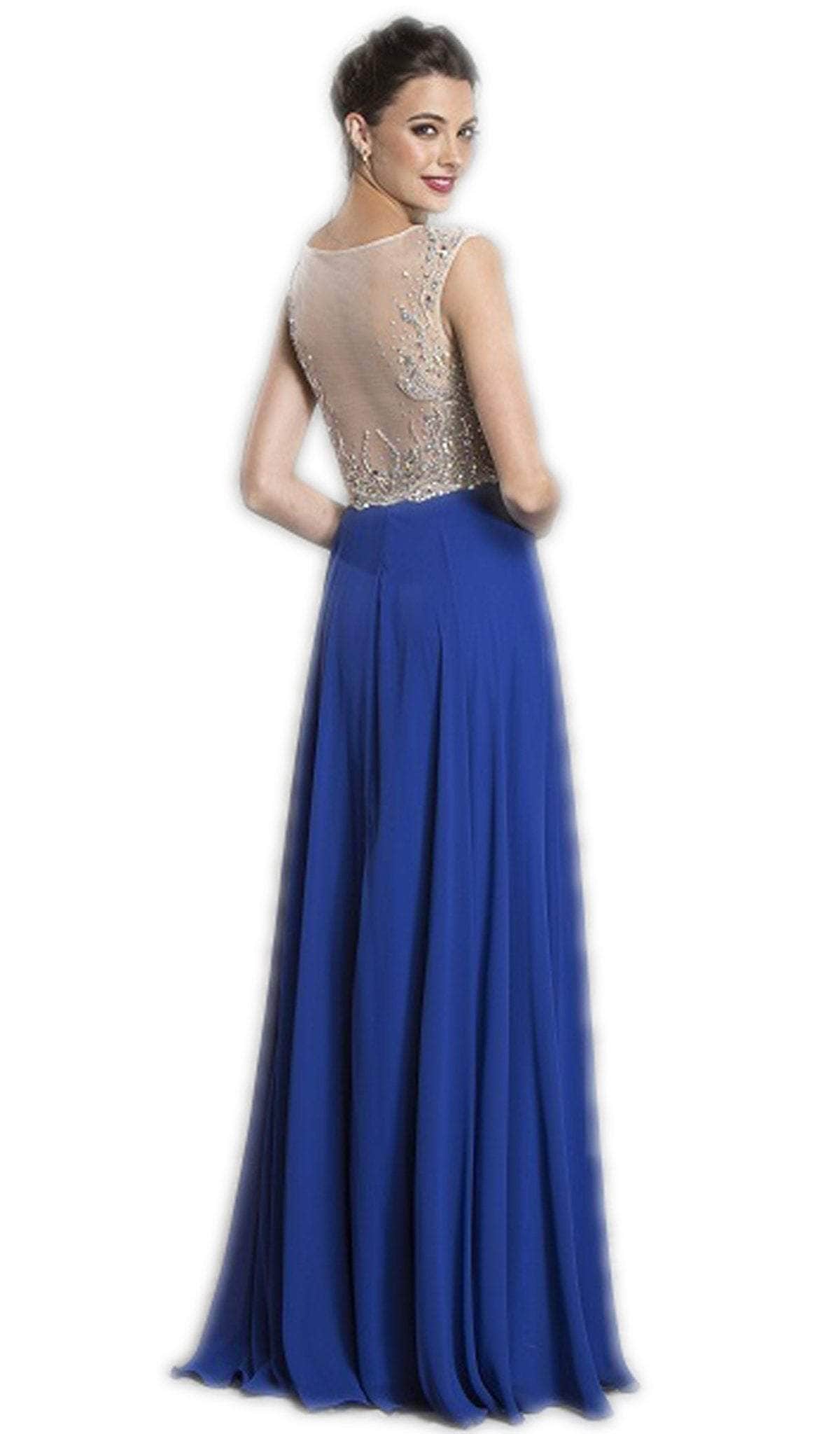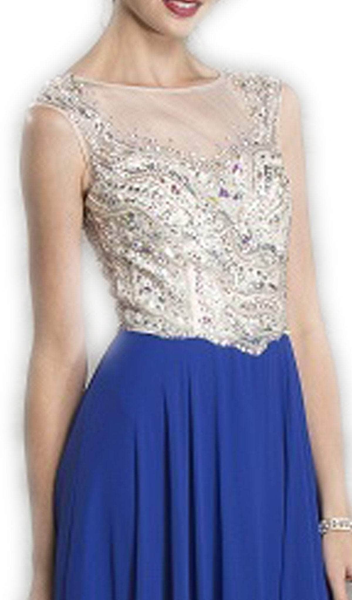 Walk in glamour and let all heads turn on you in this creation by Trevi Collection L1470. The sheer bodice features an illusion bateau neckline and cap sleeves adorned with iridescent crystal embellishments for a sparkling effect. Beautiful pleats sweep through the free flowing A-line skirt as it tapers to a full length hem. Be ready to mesmerize the night in this Trevi Collection ensemble. Model is wearing Royal color.