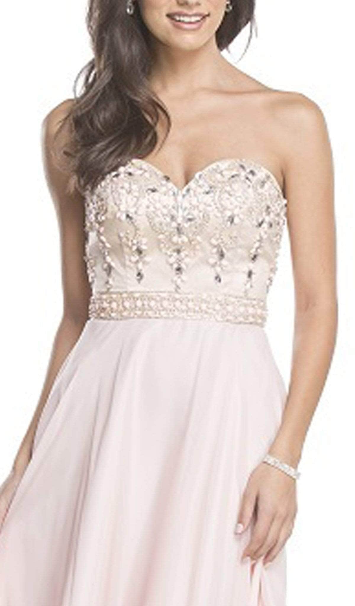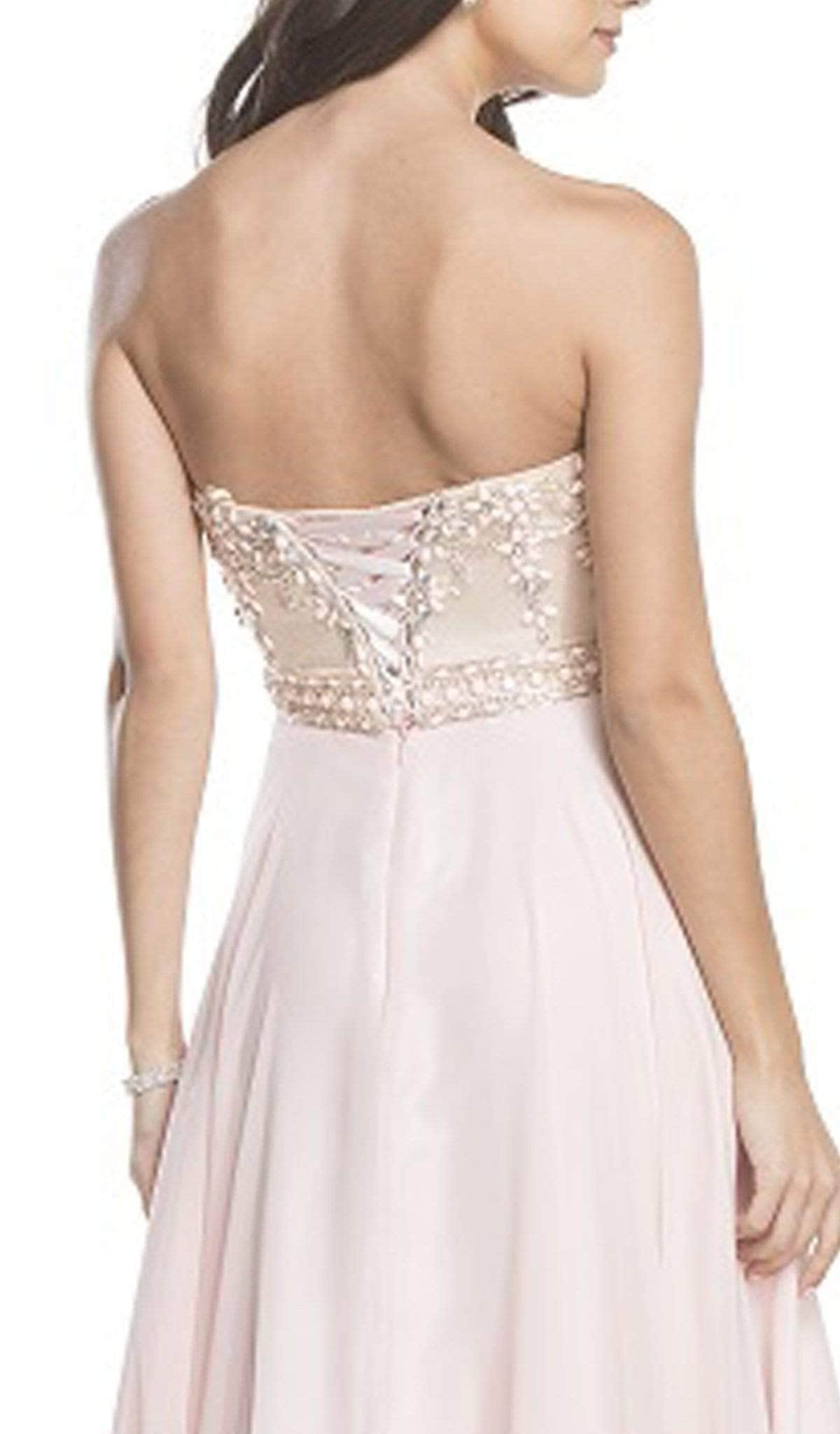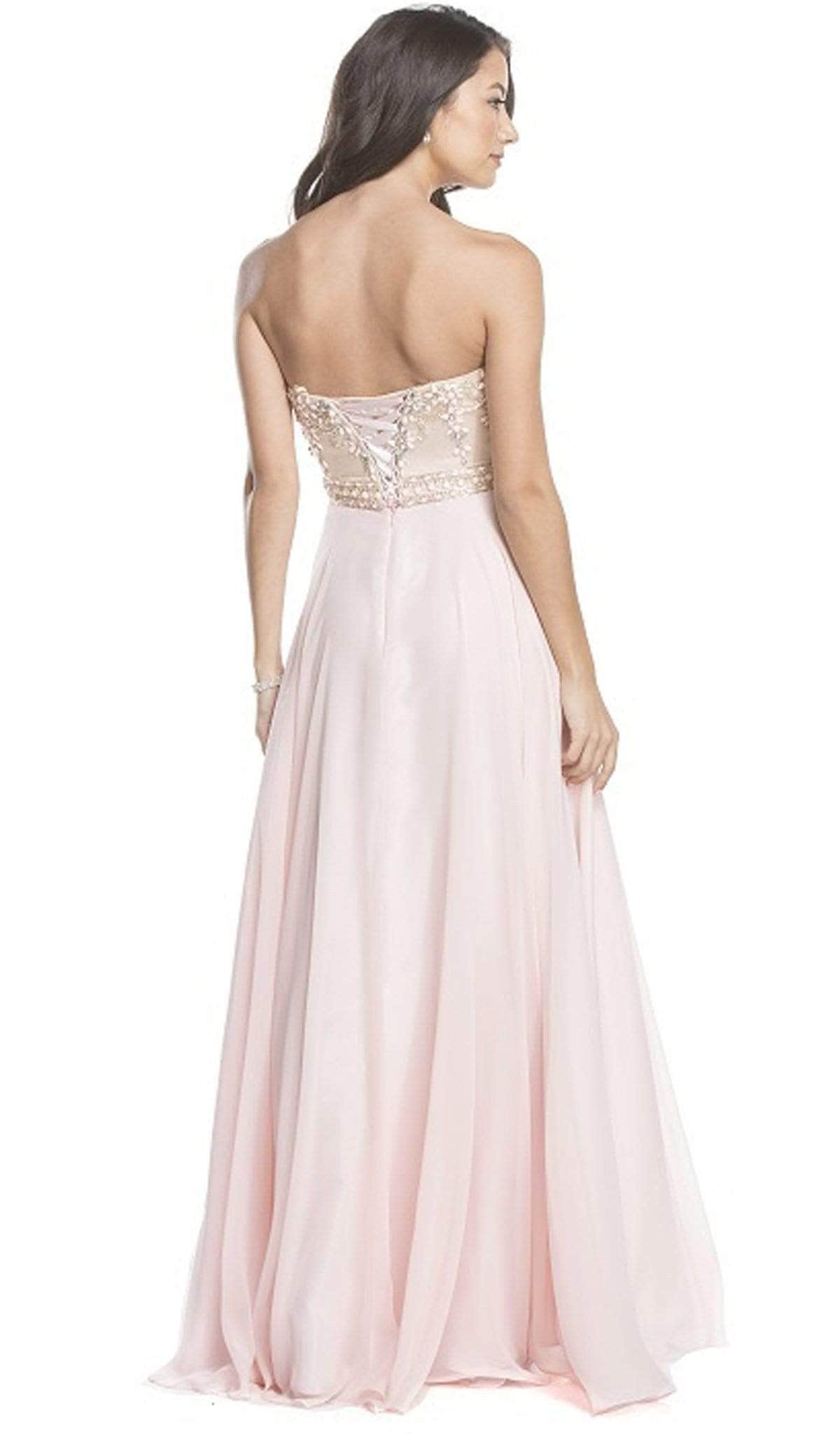 Look immaculately gorgeous in this lovely evening gown by Trevi Collection L1546. The strapless bodice showcases a defined sweetheart neckline complemented with a mid-open laced up back. Beautiful embellishments adorn the bodice as the natural waist is beaded. Pretty pleats accent the A-line skirt as it spills in folds to full-length. This Trevi Collection creation is simply breathtaking! Find more Pink Dresses.