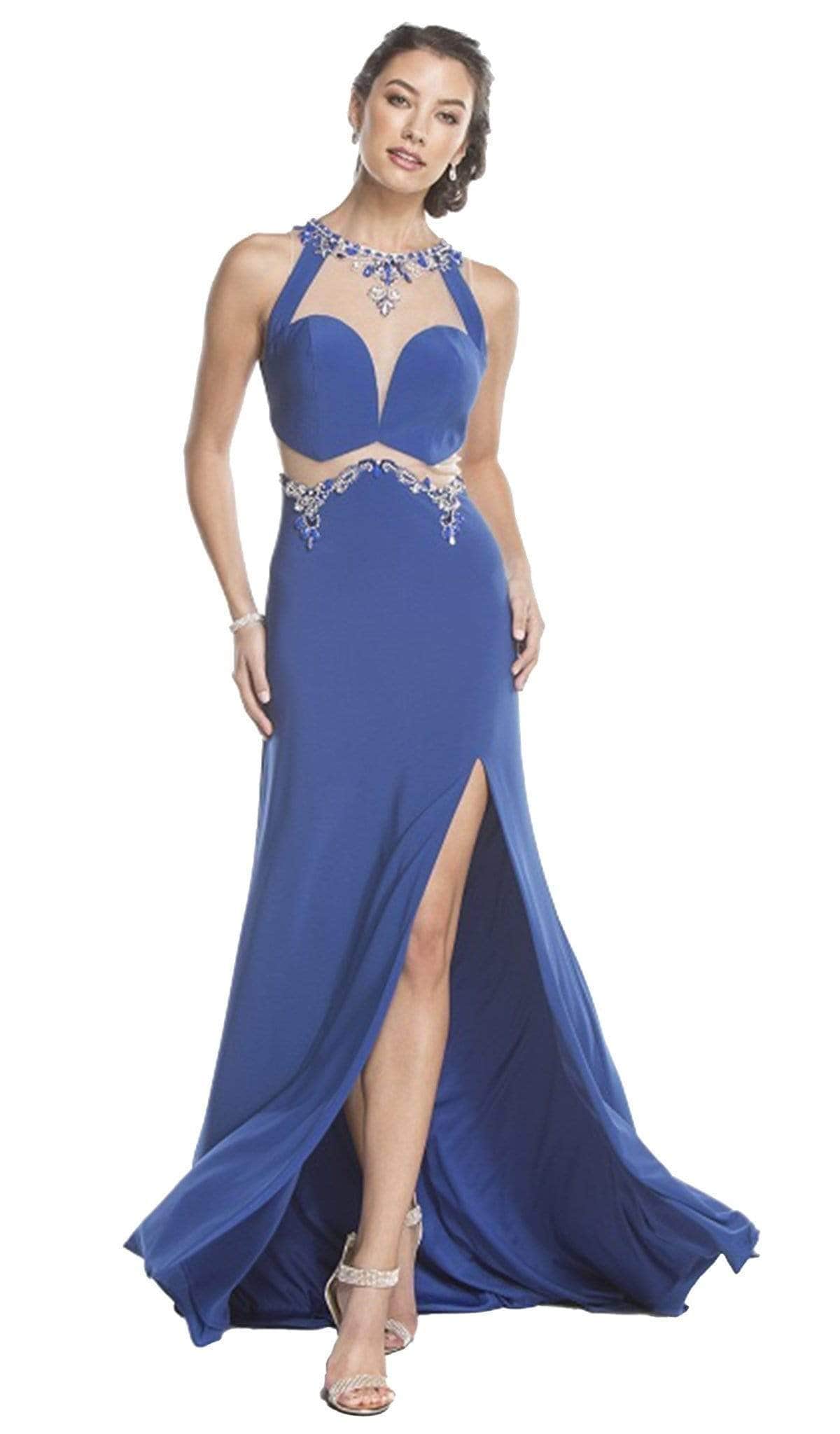 Look elegant and enchanting in this formal dress by Trevi Collection L1620. Features a sleeveless, halter neckline adorned with embellishments over its sweetheart lined fitted bodice. The waist is also accented with embellishments while the back is styled with sexy cutouts. The skirt has a fitted silhouette and is accented with a slit and sweep train. Create a perfect evening wearing this well-designed dress from Trevi Collection.