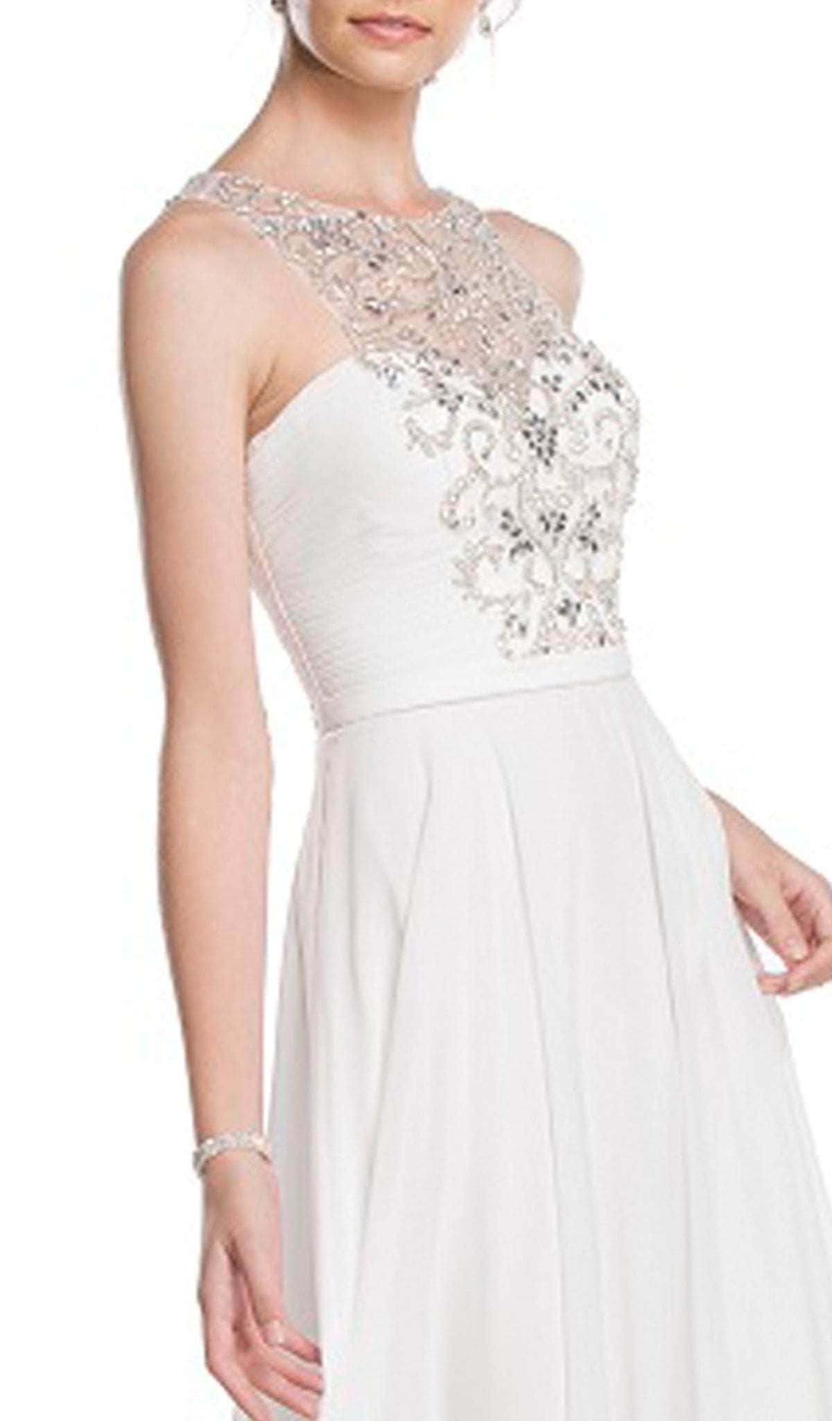 Show off your classy style when you wear this dress from Trevi Collection L1705. Sparkle with beauty in a sleeveless, illusion halter neckline with sweetheart lined bodice adorned with glittering embellishments. The waist is wrapped in a thin waistband and opens a floor-length A-line skirt. This Trevi Collection piece is a stunning look for your evening occasion. Model is wearing Off-White color.
