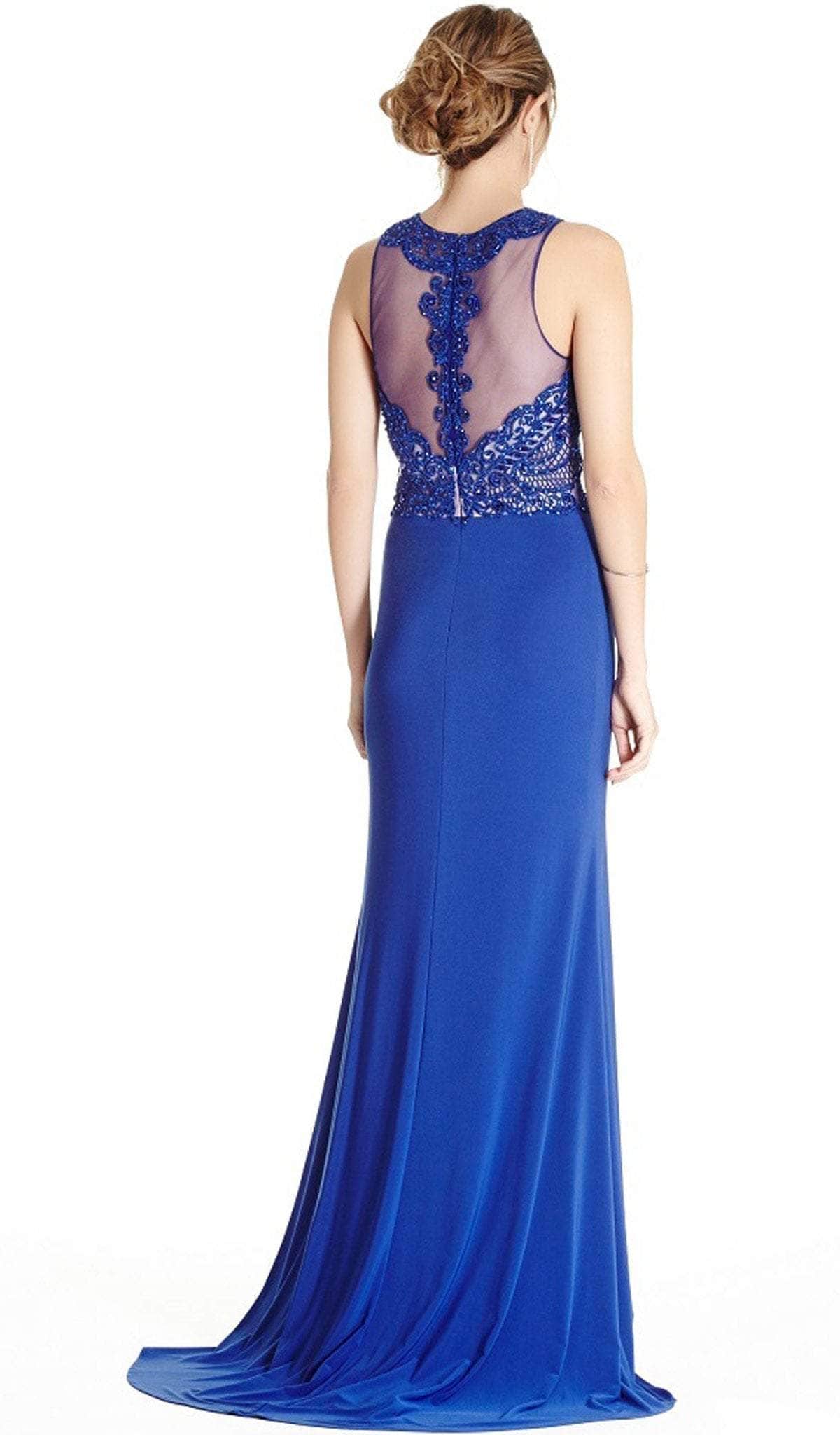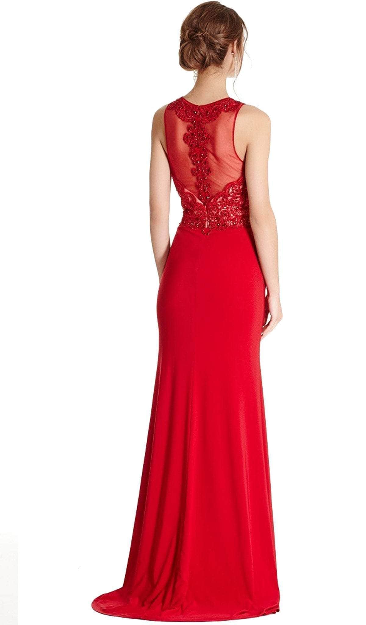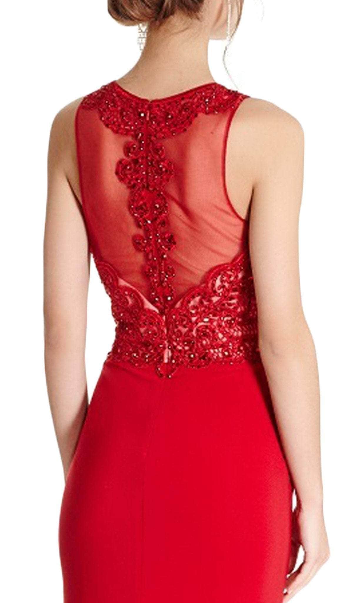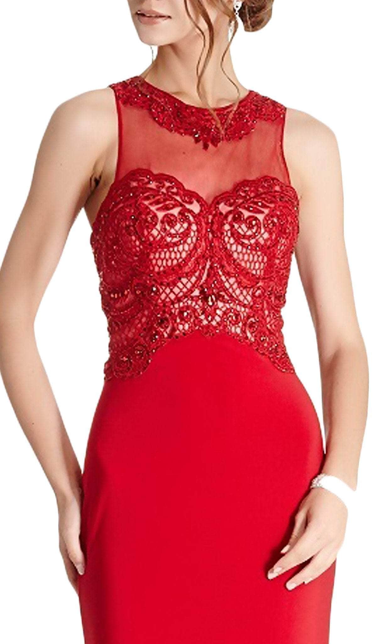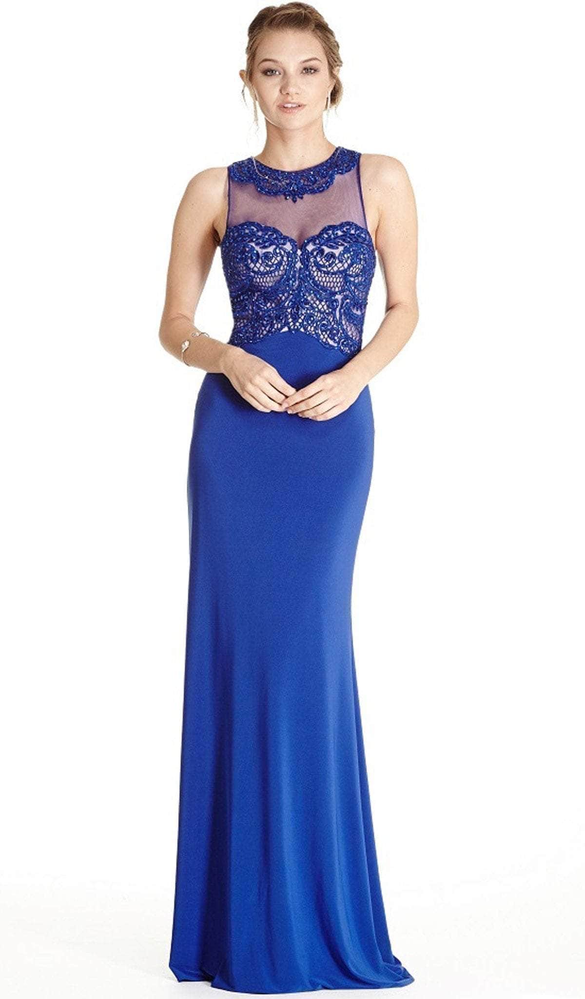 Look chic and sassy in this long alluring dress from Trevi Collection L1788. Glams in a sleeveless, jewel neckline with sheer sweetheart lined bodice adorned with embellishments. The fitted bodice gives way to a floor length sheath skirt with a sweep train finish. Walk the red carpet in style wearing this stunning Trevi Collection dress.