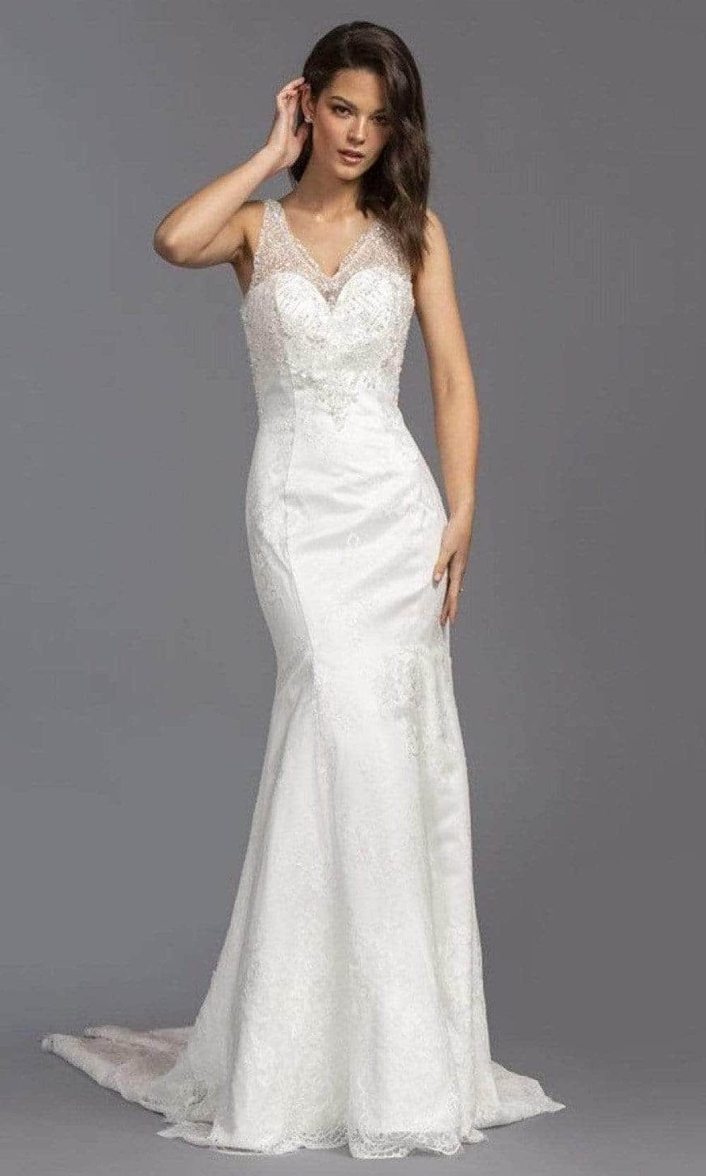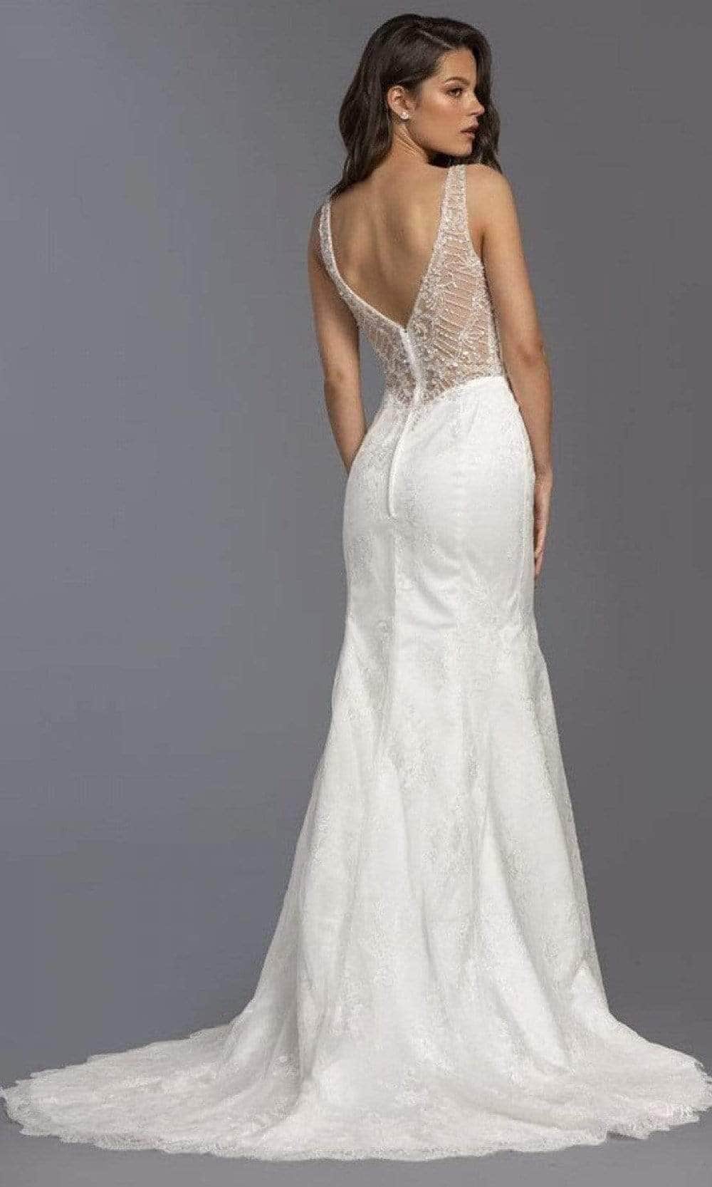 | Details: | Sleeveless, Illusion, Fitted bodice, Beads, V back, Lace, Floral, Back zipper, Floor length, Court train |